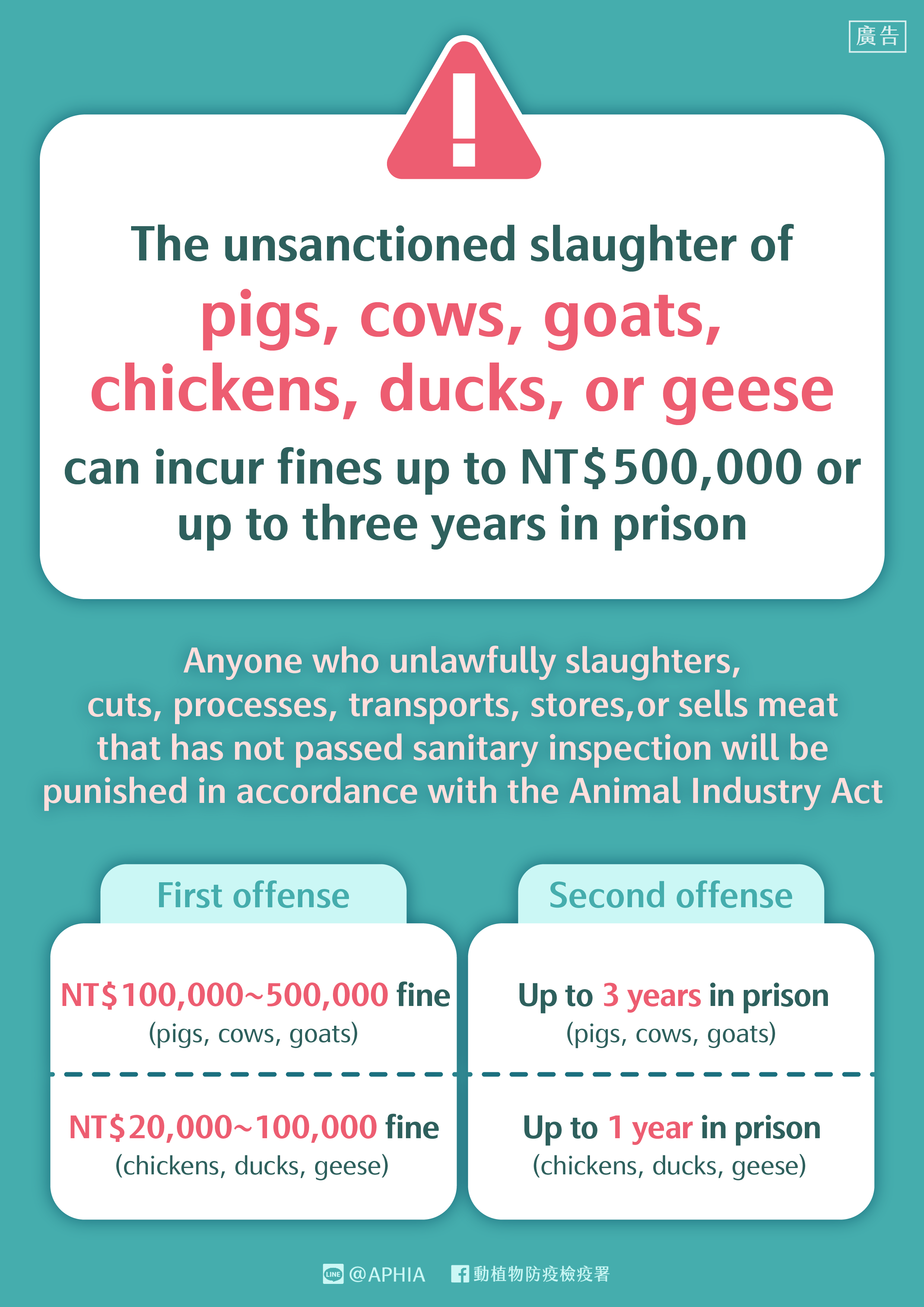 The unsanctioned slaughter of pigs, cows, goats, chickens, ducks, or geese can incur fines up to NT$500,000 or up to 3 years in prison