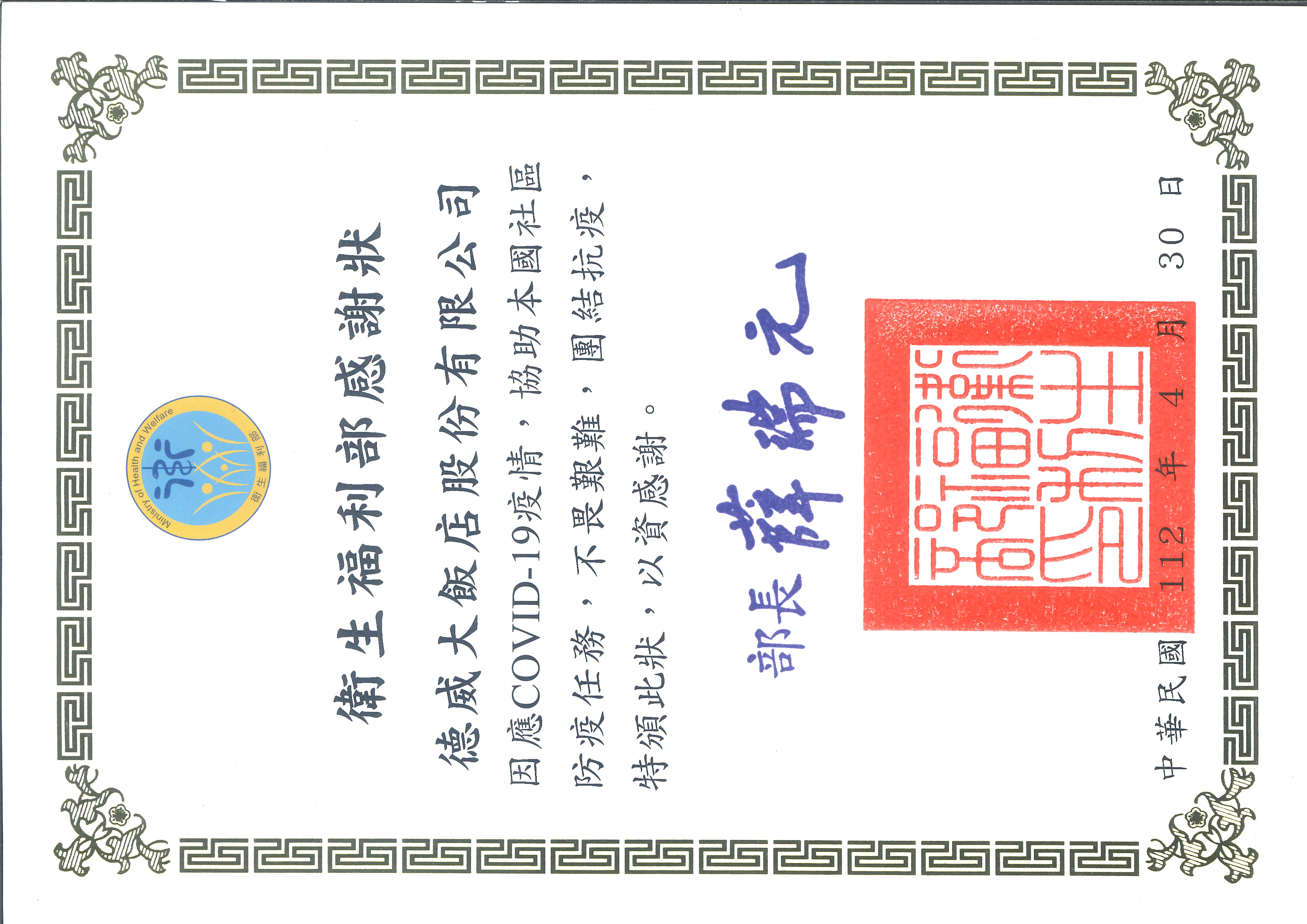 鎵興國際新竹香山富群二館(德威大飯店)獲得政府感謝狀
