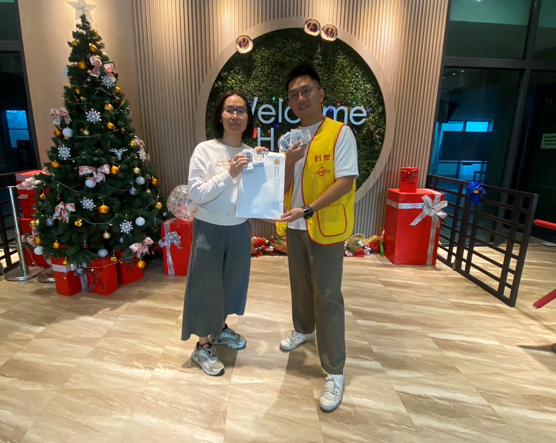 十二月二十五日(週一),高雄分公司移工朋友透過公司同仁之協助,於高雄大學城宿舍內舉行「愛心發票捐赠活動」,在移工朋友主動徵集,以及高雄分公司提供抽獎卷及緻聖誕禮物之催動下,合計共徵得 735 張發票,事後並全數捐赠與「創世基金會」。該基金會周煜凱先生亦致贈感謝狀,以表示對鎵興移工朋友之肯定及謝忱,並由同仁張惠甄代表接受。