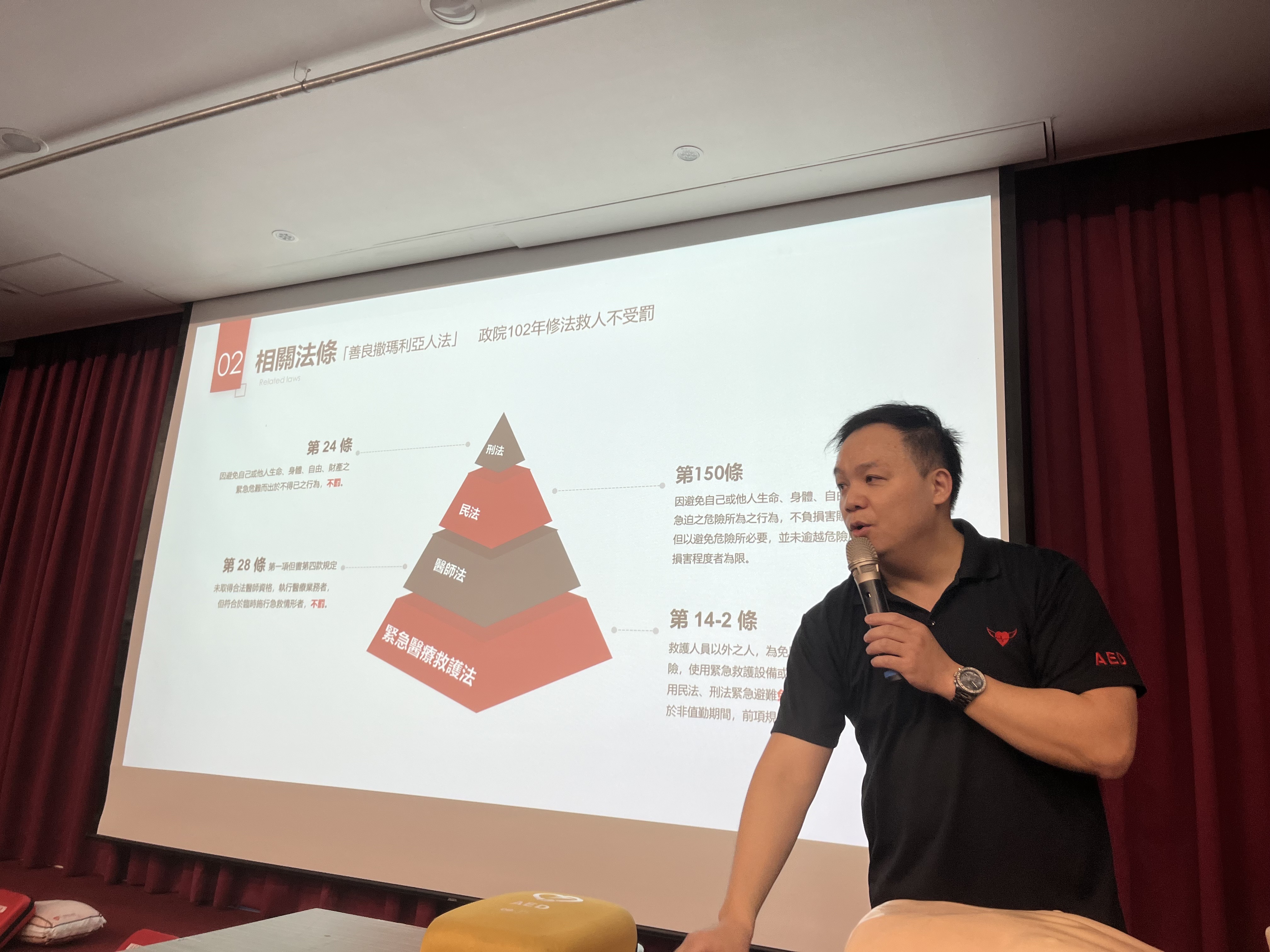演練後,由公司所聘請的「思傑夢想」公司吳建橋老師,講授使用AED(體外心臟電擊去顫器)的急救步驟及方法,同時進行實際演練,期許同仁皆能習得「叫叫CD」的口訣,並能有效運用「開貼插電」的使用步驟,方能於急切之際,快速救助失去意識及呼吸瀕危的人士。