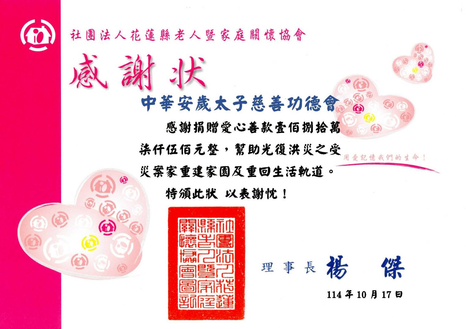 鎵興國際董事長黎金生、總經理黎高興先生,有感於花蓮同袍所受之苦難,連同安歲太子慈善功德會之大德成員,隨即發起募款,並將募得之壹佰捌拾萬柒仟伍佰元,全數捐贈予實際於地方第一線從事老人關懷的「社團法人花蓮縣老人暨家庭關懷協會」,該筆善款由該會理事長楊傑先生代表接受,並將以專款專用模式,將之用於「洪災之受災戶重建家園及重回生活軌道」之上。