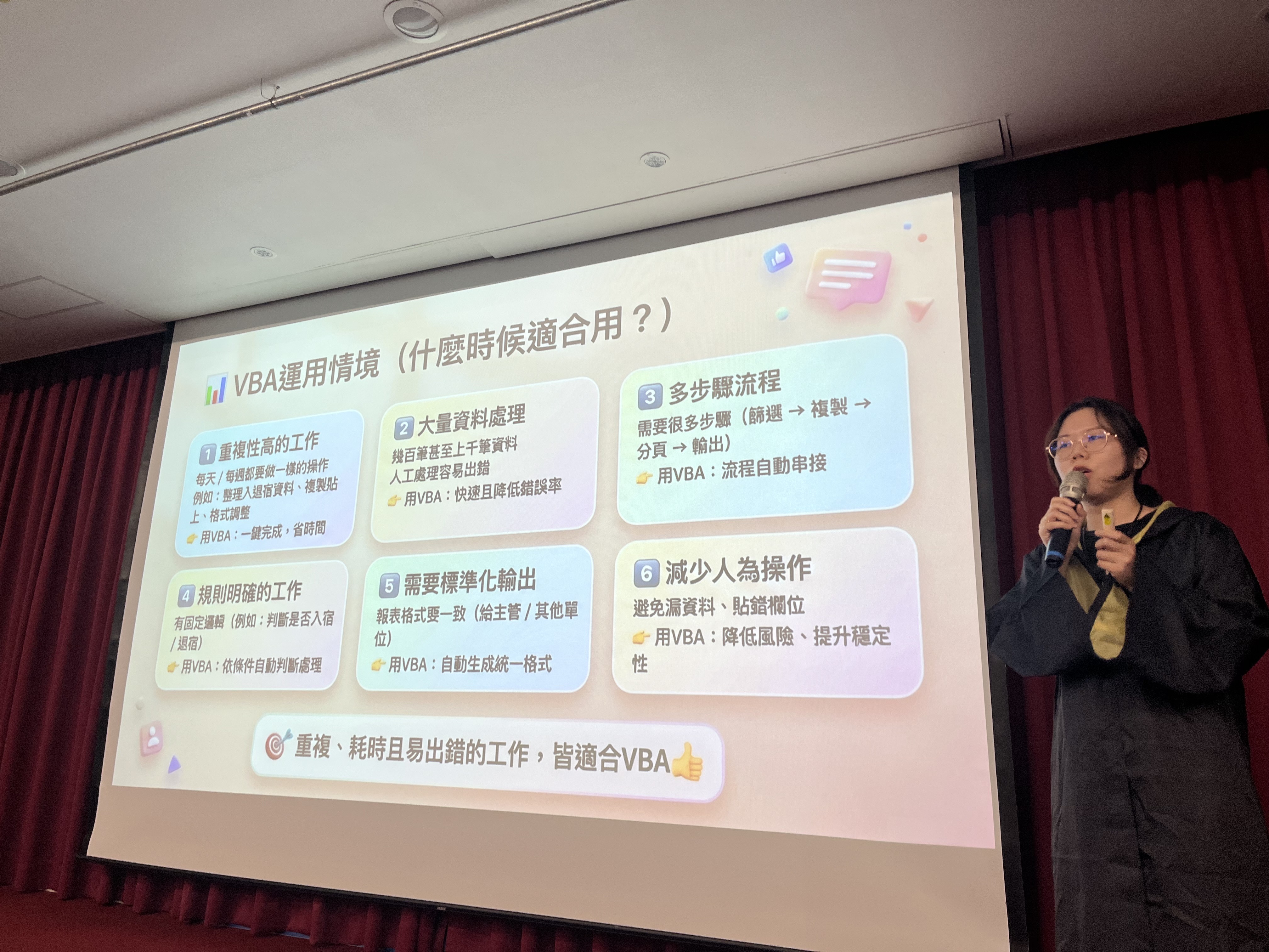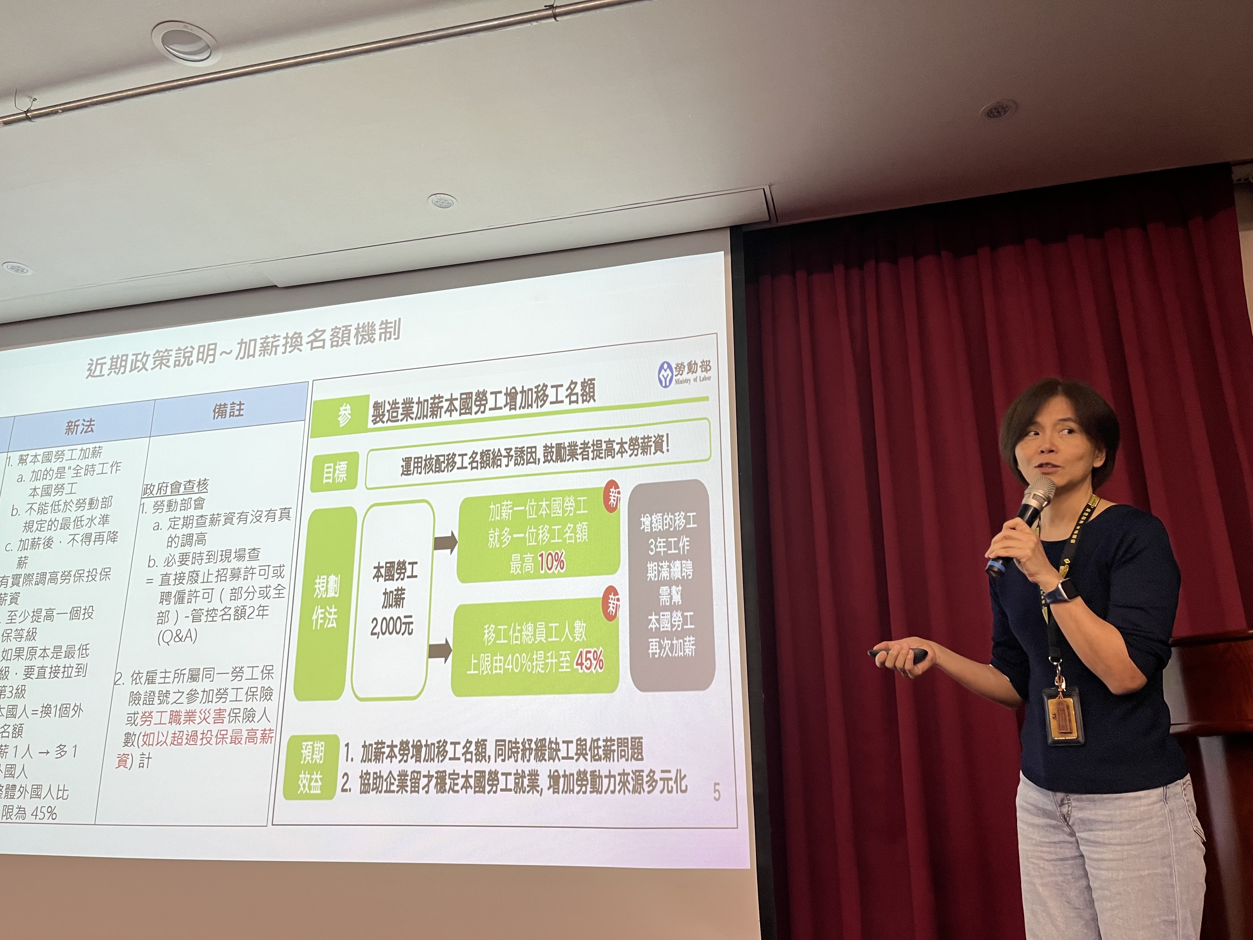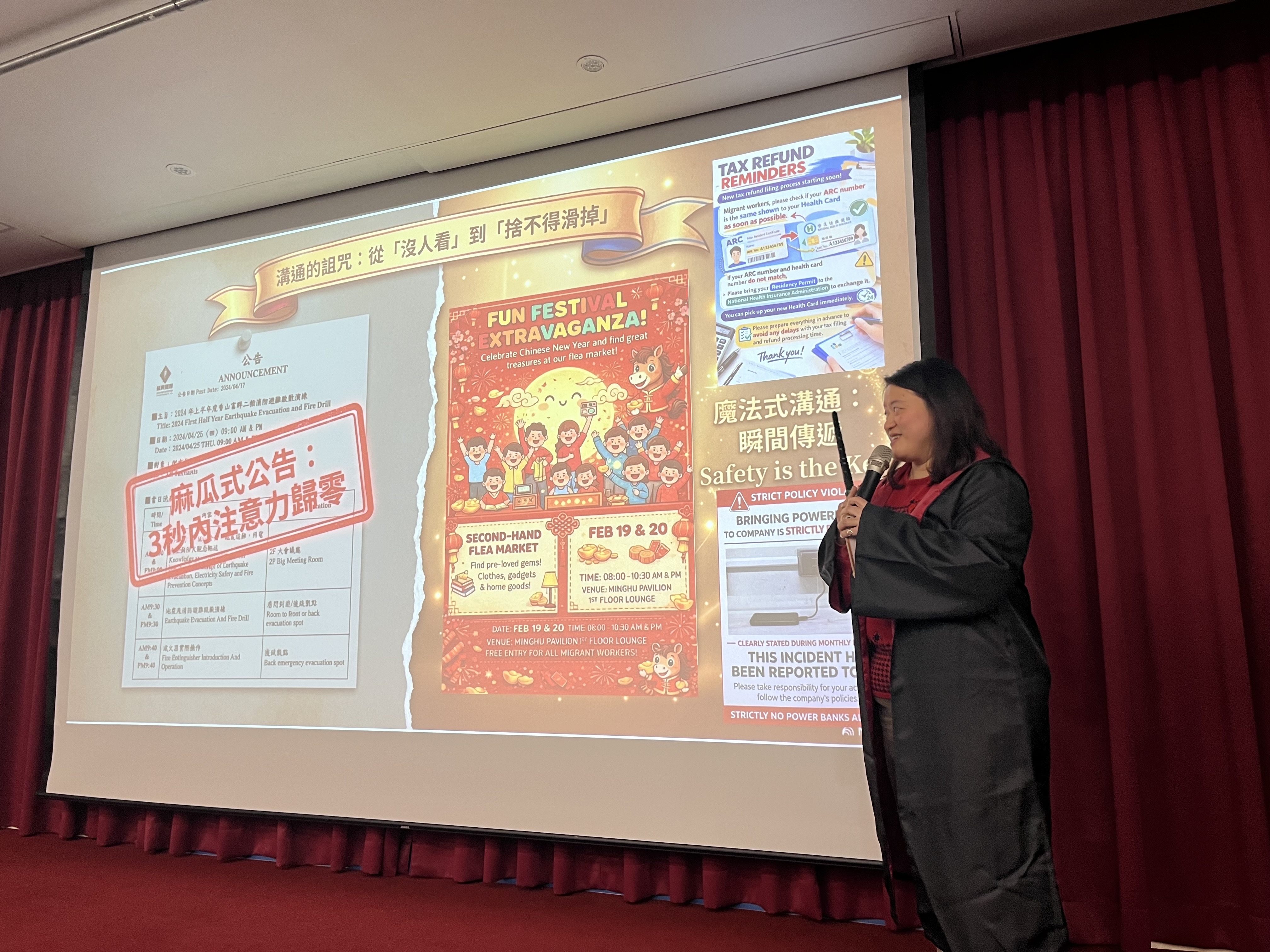 於法令宣導部分,由林美珠副總特別將近日以來與移工政策放寬的重大部分,向同仁說明,所觸及之主題包括「本籍勞工加薪換名額」、「製造業核配移工機制簡圖」、「勞動部強迫勞動之指引」、「觸法後之罰則,以及家庭幫傭申請政策放寬」等等。為強化學習,隨後以電子問卷方式進行檢核並做解答說明。在 AI 運用部分,宿管單位的同仁分別就 NotebookLM, Gemini, Canvas 結合VBA、評鑑表單生成、公佈欄公告上架、Adobe Firely 生成吸睛影片、以及 Excel 結合 VBA 的諸多運用。藉由同仁之分享內容,以及實際操作的感受,相信AI的實際運用,隨AI產業的蓬勃發展,在鎵興之內會也更為成熟、快速。