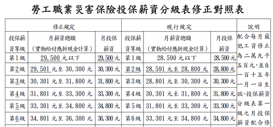 此次職業災害保險級距之修正,係因應基本公司於明年一月一日調漲之故,是以將職災保險之第一級,修正為台幣29,500元以下。