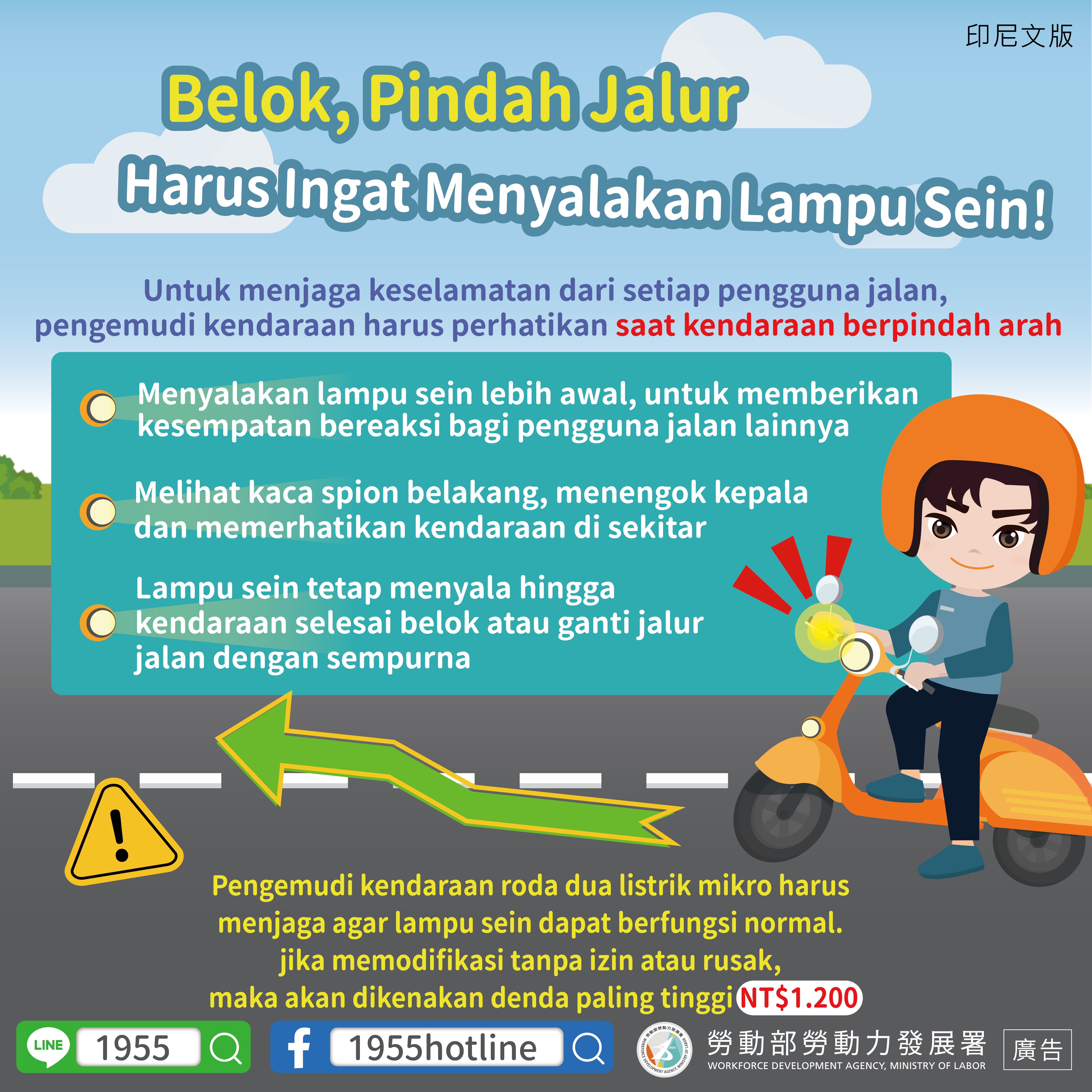 Pengemudi kendaraan roda dua listrik mikro harus menjaga agar lampu sein dapat berfungsi normal. jika memodifikasi tanpa izin atau rusak, maka akan dikenakan denda paling tinggi NT$1.200