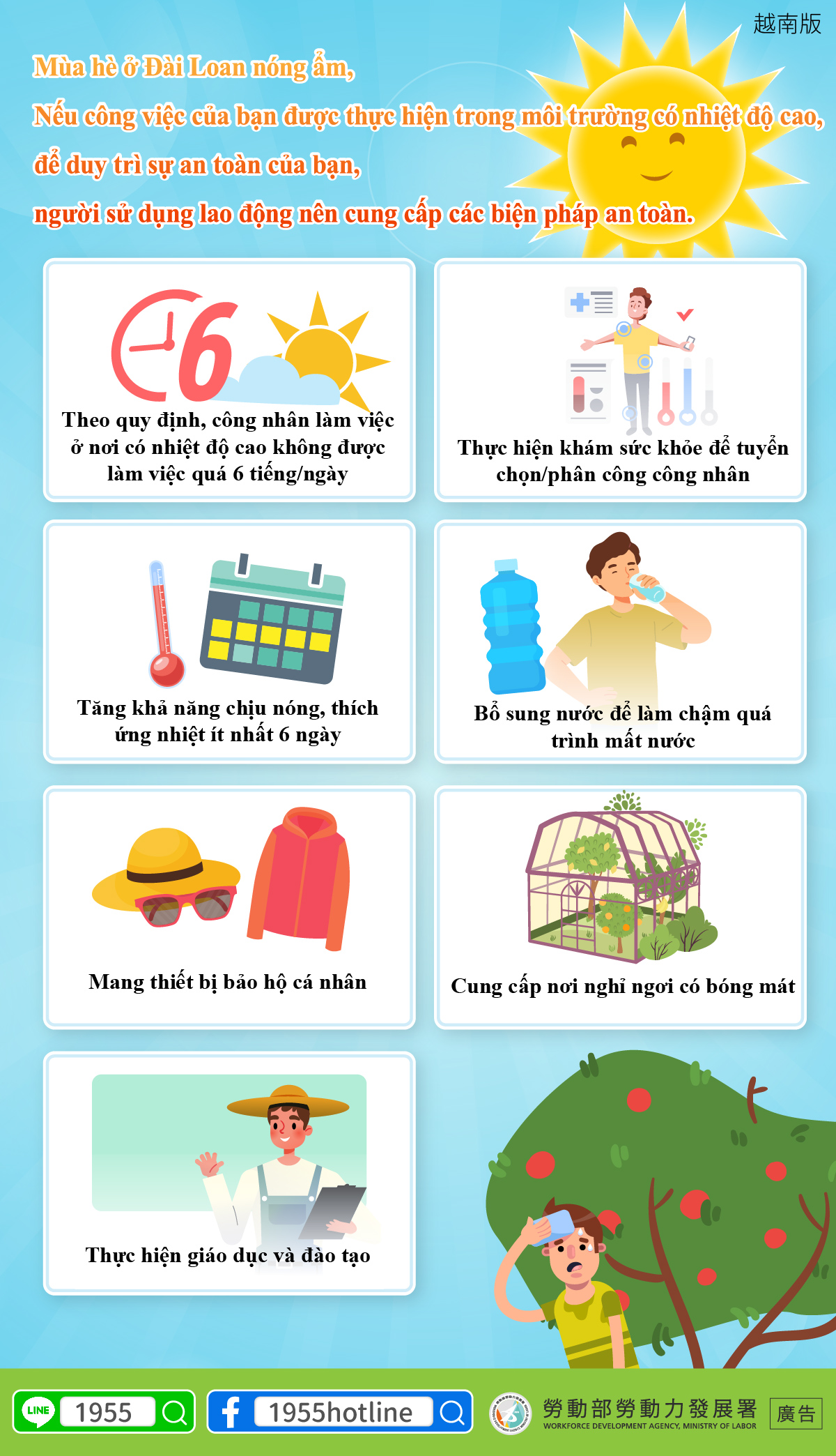▍Mùa hè ở Đài Loan nóng ẩm,Nếu công việc của bạn được thực hiện trong môi trường có nhiệt độ cao,để duy trì sự an toàn của bạn,người sử dụng lao động nên cung cấp các biện pháp an toàn.