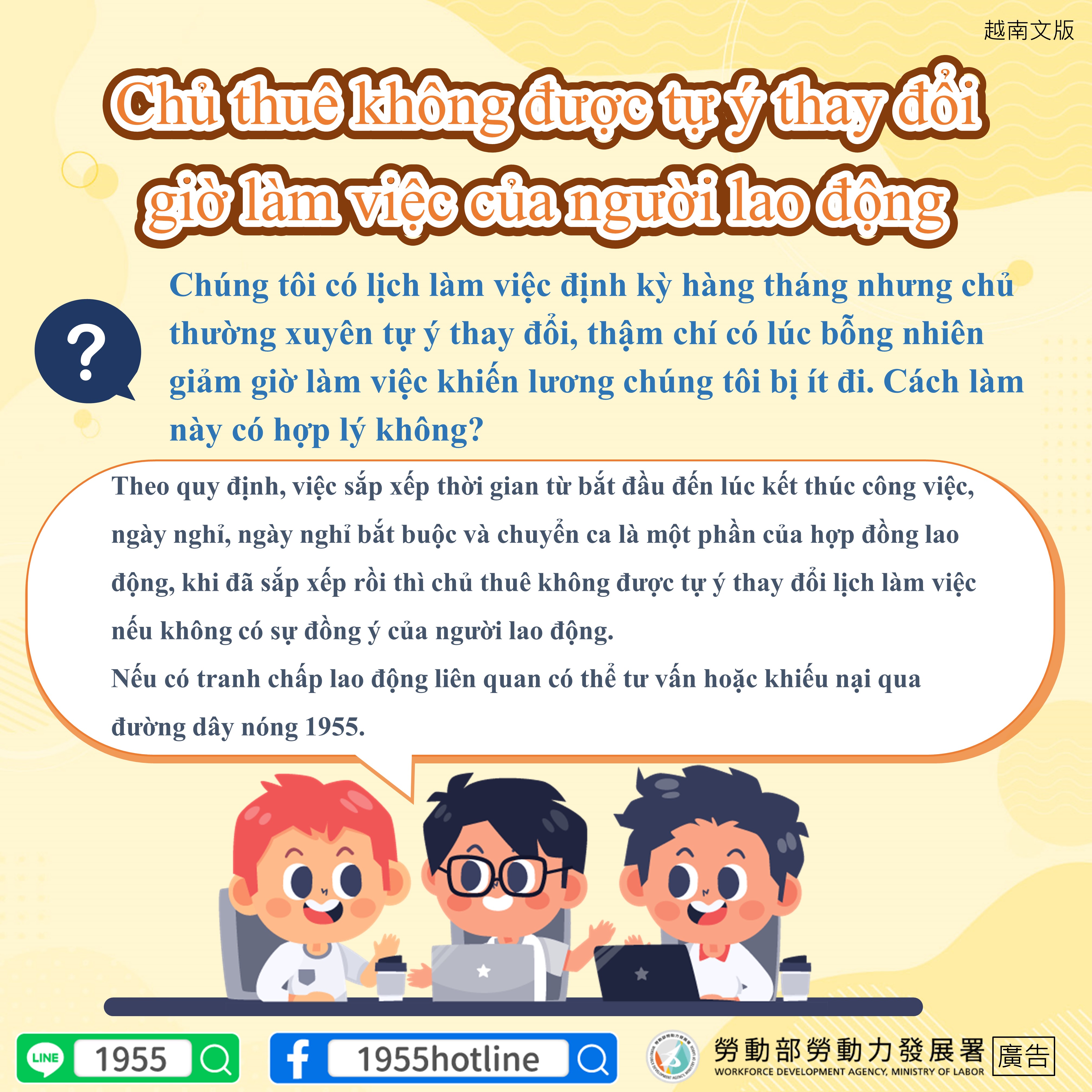 According to regulations, the arrangement of work schedules, including the time work starts and finishes, leave days, holidays, shifts and shift changes, are part of the labor contract.Once these have been agreed an employer cannot make any changes without the prior agreement of the worker.If you encounter a related labor dispute, contact the 1955 hotline for a consultation or to file a complaint.