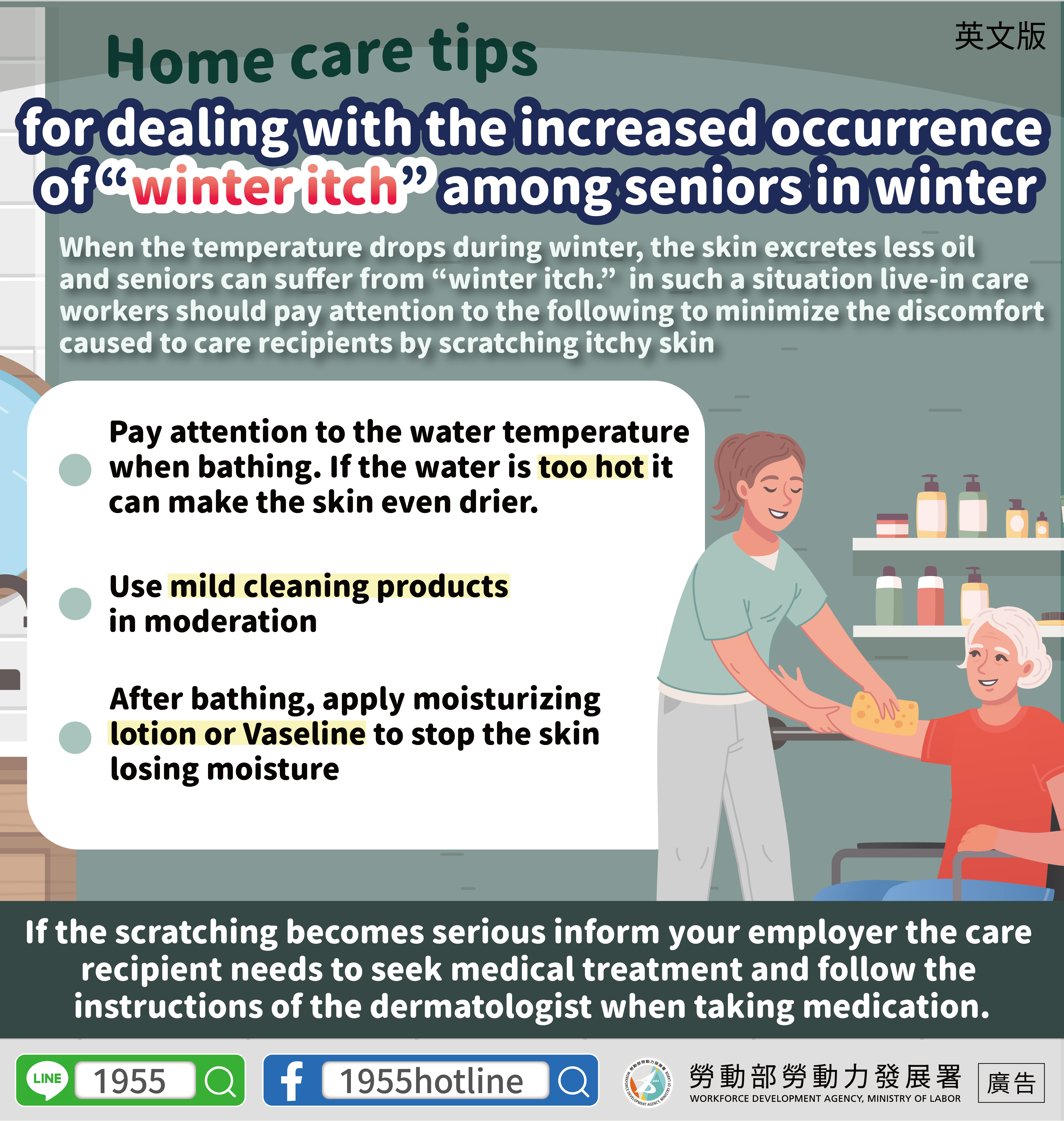 冬天溫度降低,皮膚油脂分泌減少,長輩往往會有「冬季癢」的皮膚問題,家庭看護在照顧長輩時,可以多加留意幾個細節,讓長輩降低搔癢帶來的困擾喔!