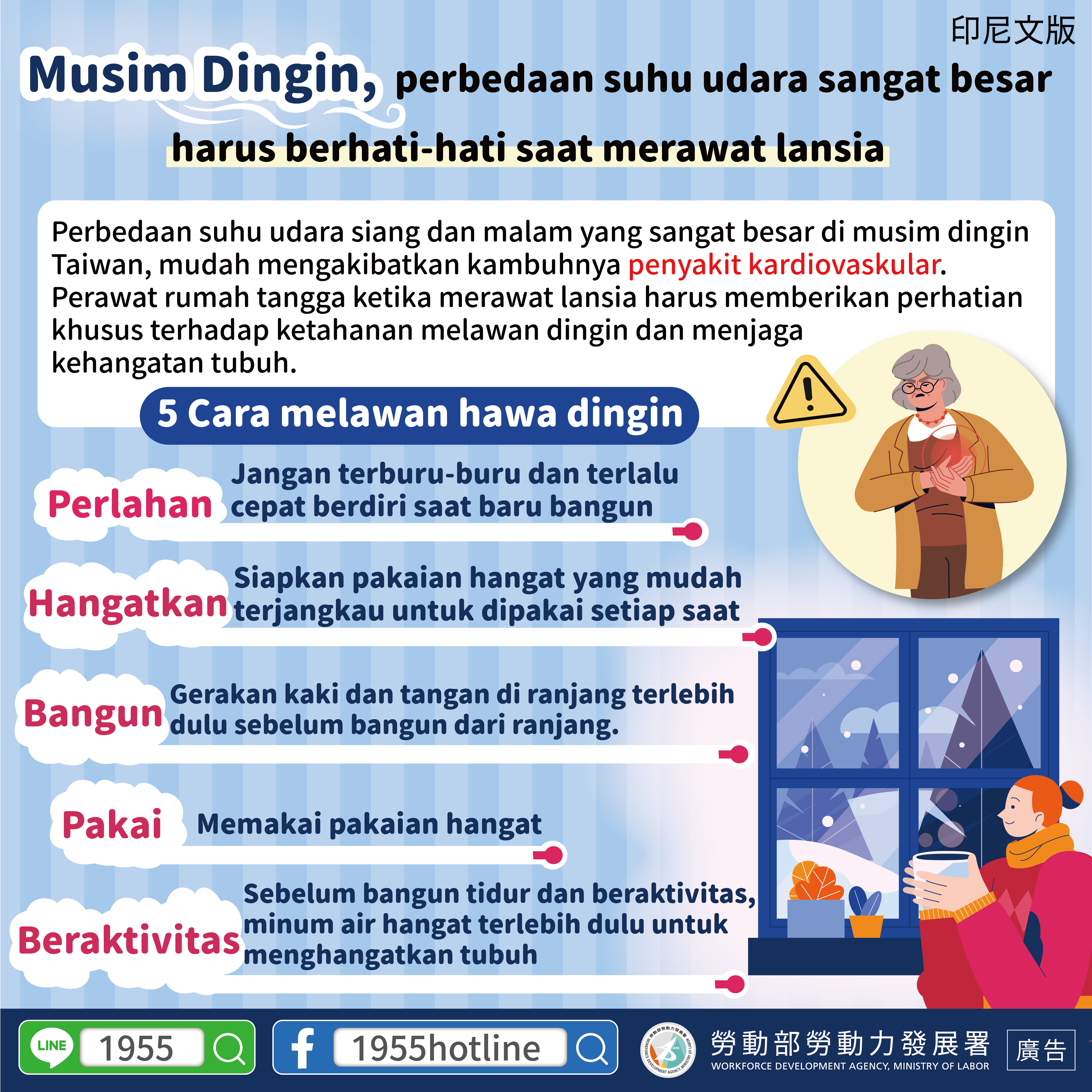 Perbedaan suhu udara siang dan malam yang sangat besar di musim dingin Taiwan, mudah mengakibatkan kambuhnya penyakit kardiovaskular. Perawat rumah tangga ketika merawat lansia harus memberikan perhatian khusus terhadap ketahanan melawan dingin dan menjaga kehangatan tubuh.