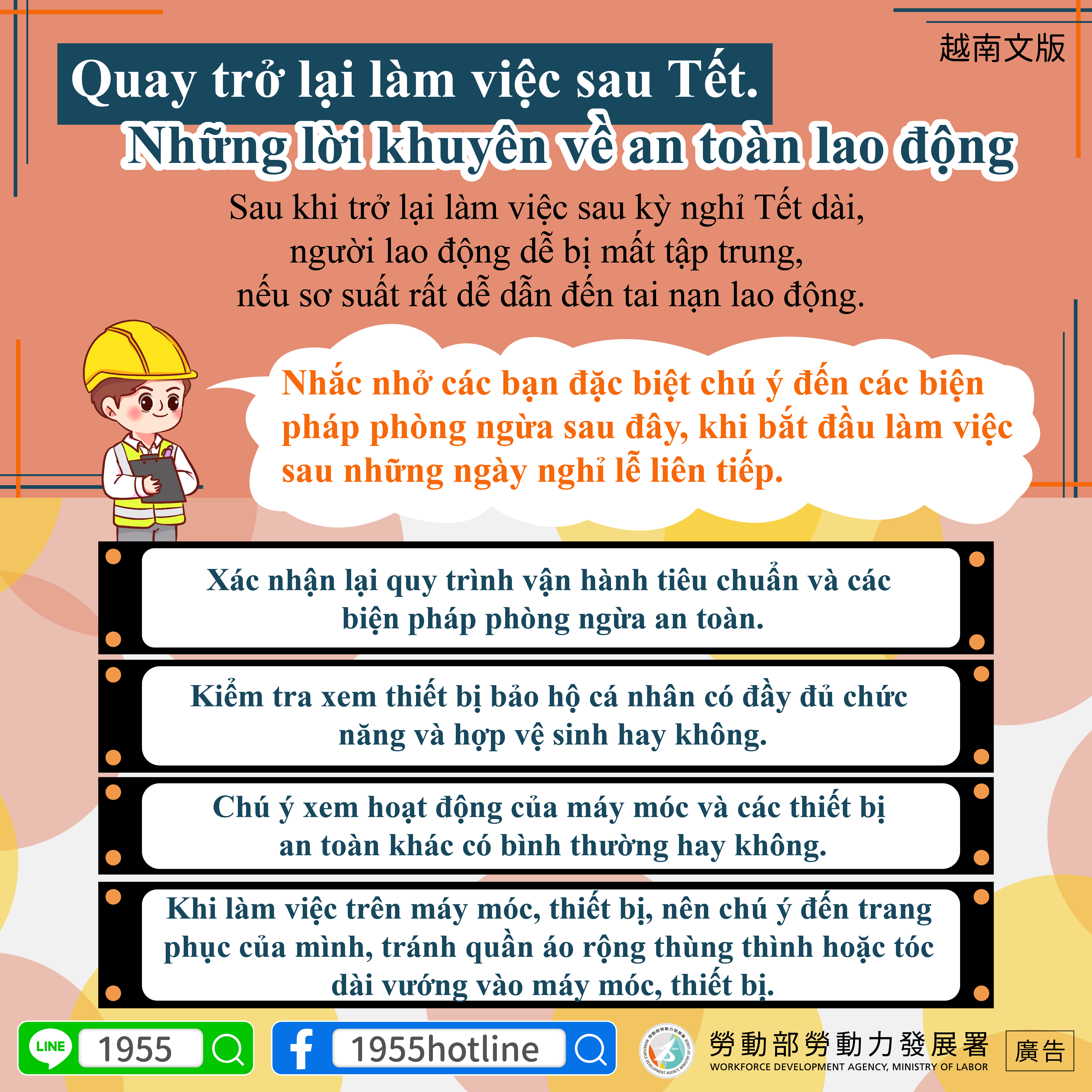 提醒各位移工在連假結束後,應特別留意以下開工注意事項