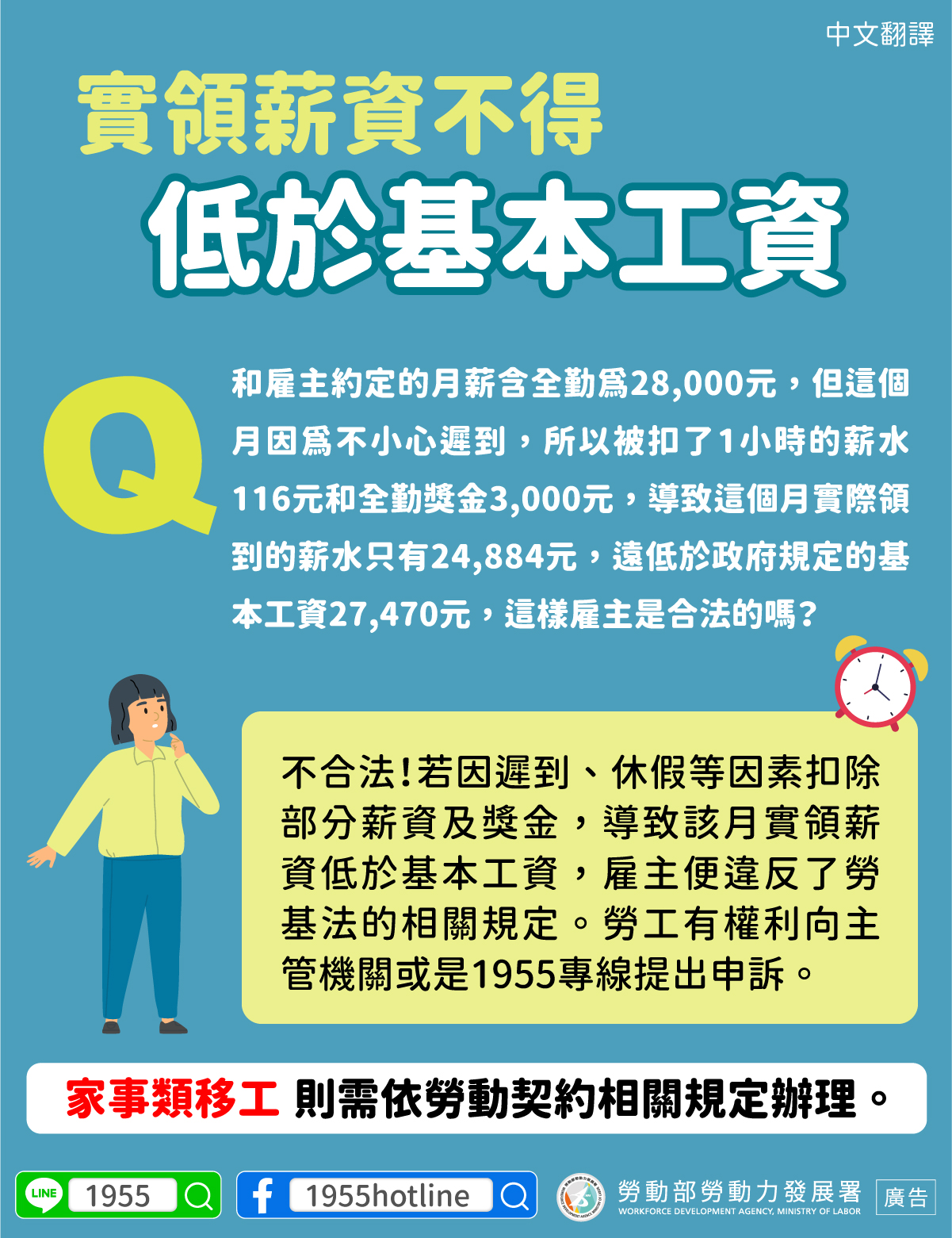 Q: เงินเดือนที่ตกลงกับนายจ้างรวมเบี้ยขยันคือ 28,000 เหรียญ แต่เนื่องจากเดือนนี้มาทำงานสายจึงถูกหักค่าจ้าง 1 ชั่วโมง เป็นเงิน116 เหรียญและเบี้ยขยัน 3,000 เหรียญ ทำให้เดือนนี้ได้รับเงินเดือนแค่ 24,884 เหรียญ ต่ำกว่าค่าจ้างขั้นต่ำที่รัฐบาลไต้หวันกำหนดคือ 27,470 เหรียญ แบบนี้ถือว่านายจ้างทำถูกต้องตามกฎหมายหรือไม่ ?