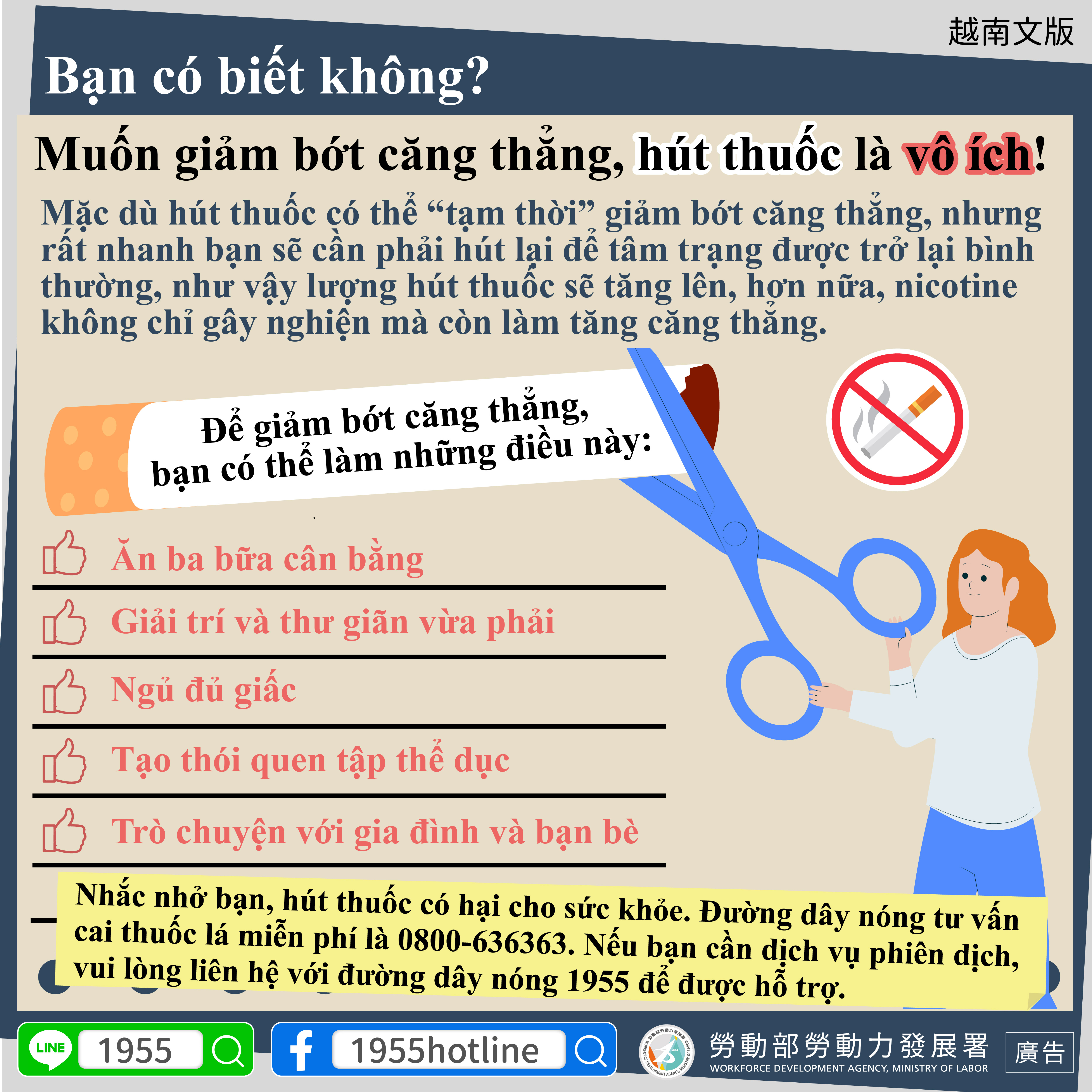 Remember, smoking is bad for your health. The smoking cessation hotline is 0800-636363. If you require an interpretation service, call the 1955 Hotline and ask for assistance