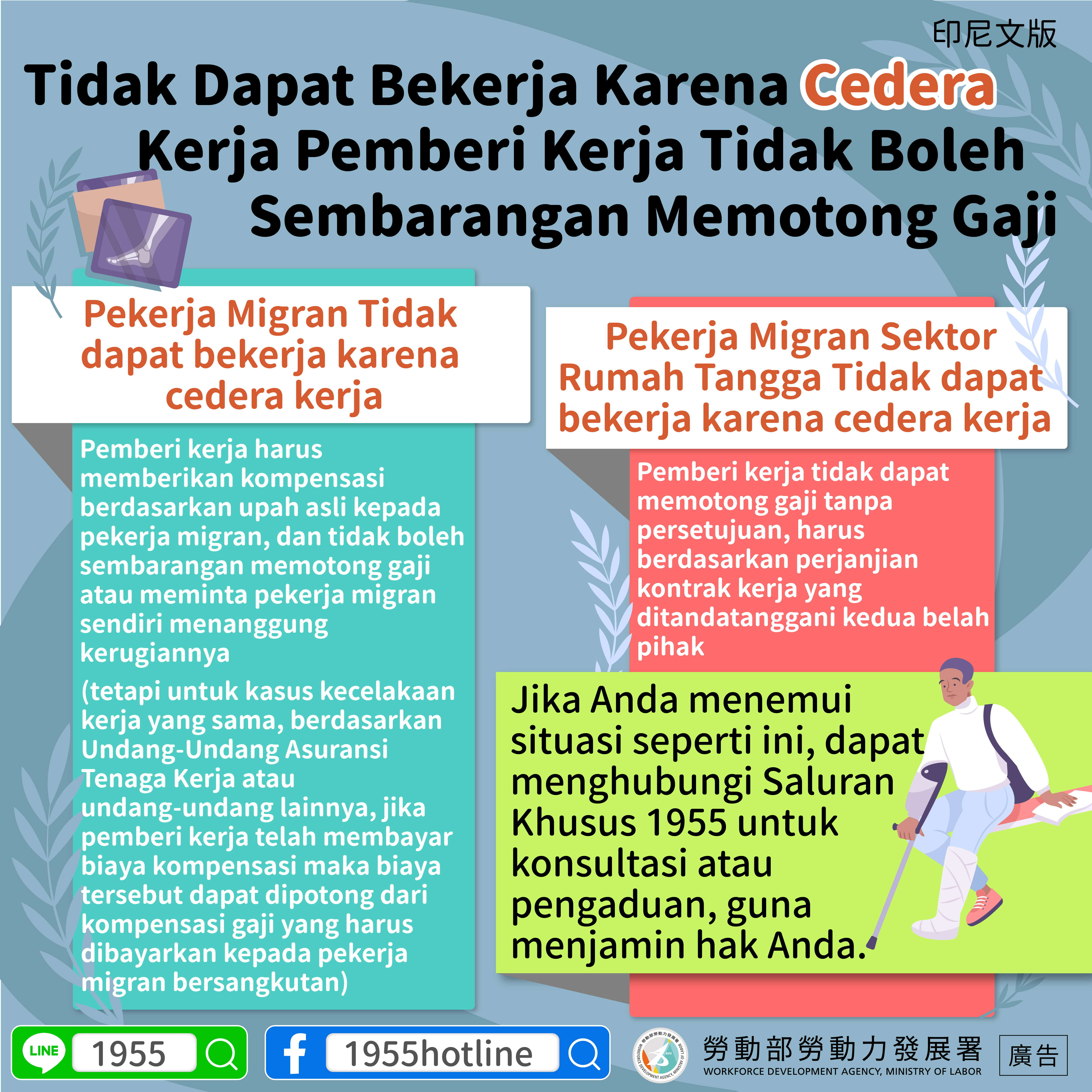 •Pekerja Migran Sektor Rumah Tangga Tidak dapat bekerja karena cedera kerja:Pemberi kerja tidak dapat memotong gaji tanpa persetujuan, harus berdasarkan perjanjian kontrak kerja yang ditandatanggani kedua belah pihak