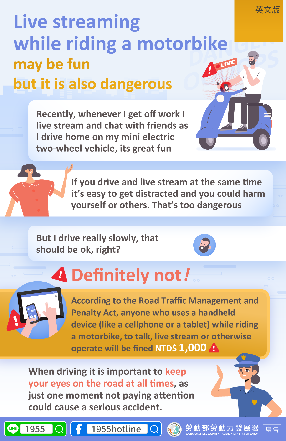 According to the Road Traffic Management and Penalty Act, anyone who uses a handheld device (like a cellphone or a tablet) while riding a motorbike, to talk, live stream or otherwise operate will be fined NTD$ 1,000
