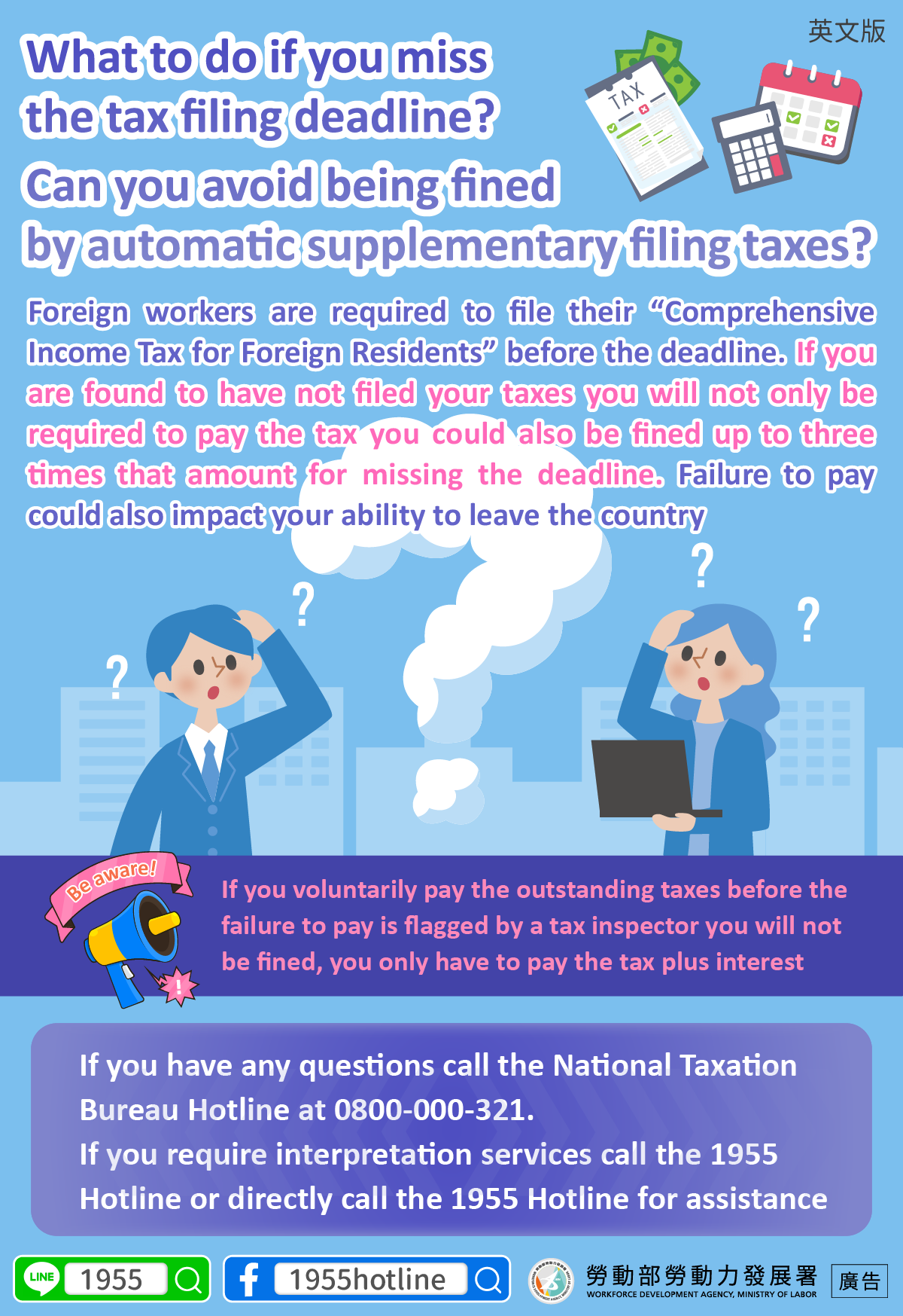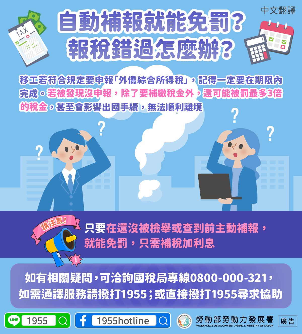 如有相關疑問,可洽詢國稅局專線0800-000-321,如需通譯服務請撥打1955;或直接撥打1955尋求協助