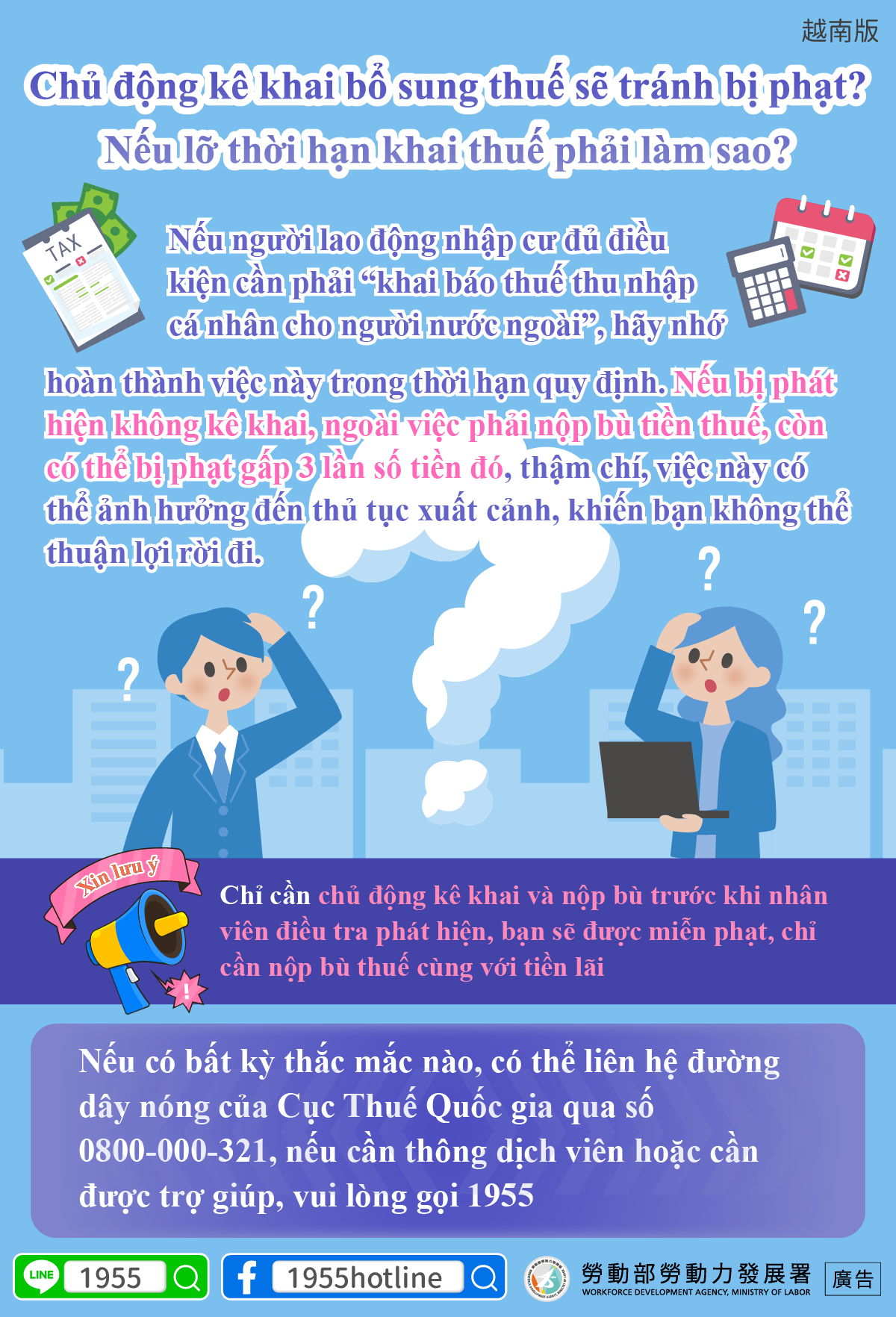 Nếu có bất kỳ thắc mắc nào, có thể liên hệ đường dây nóng của Cục Thuế Quốc gia qua số 0800-000-321, nếu cần thông dịch viên hoặc cần được trợ giúp, vui lòng gọi 1955