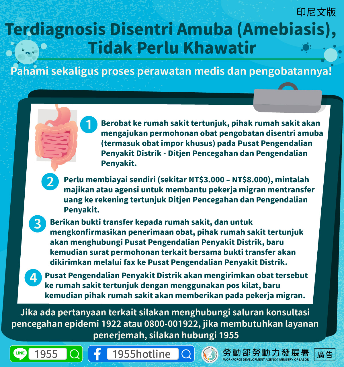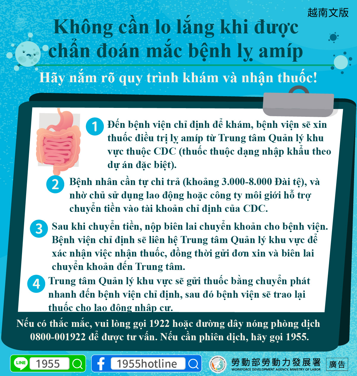 1.Go to a designated hospital for treatment; the hospital will apply to a regional center under the Taiwan Centers of Disease Control (CDC) for the medication (which is specifically approved for importation) to treat amebic dysentery