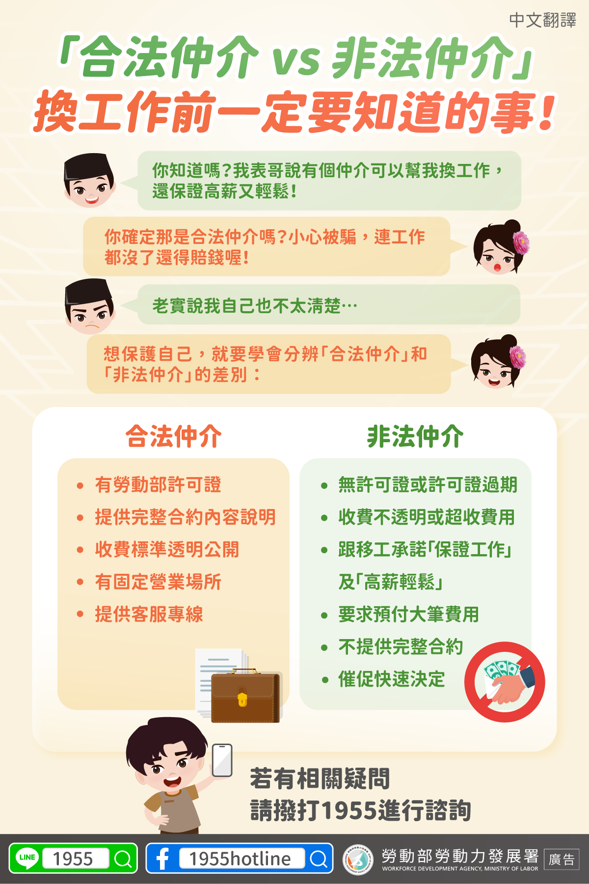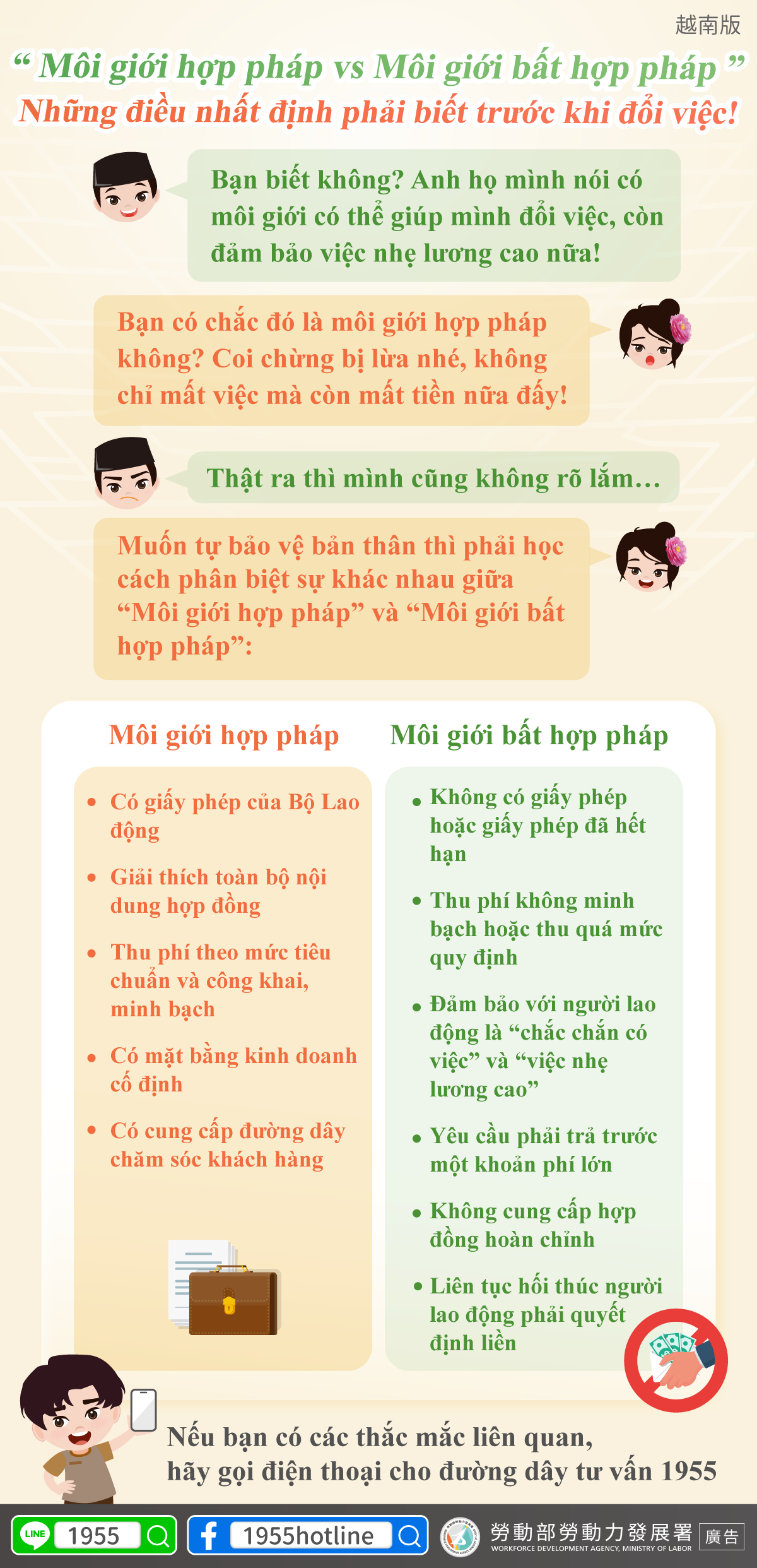 B:想保護自己,就要學會分辨「合法仲介」和「非法仲介」的差別: