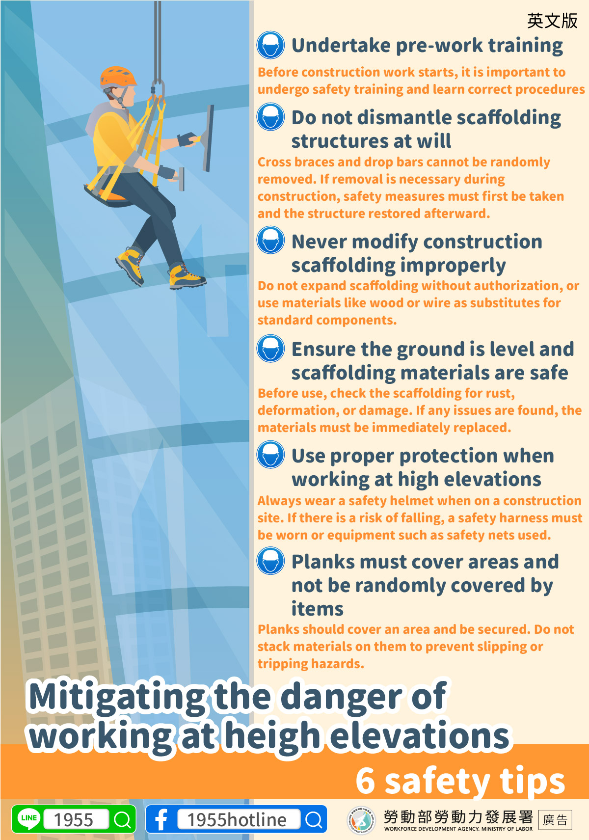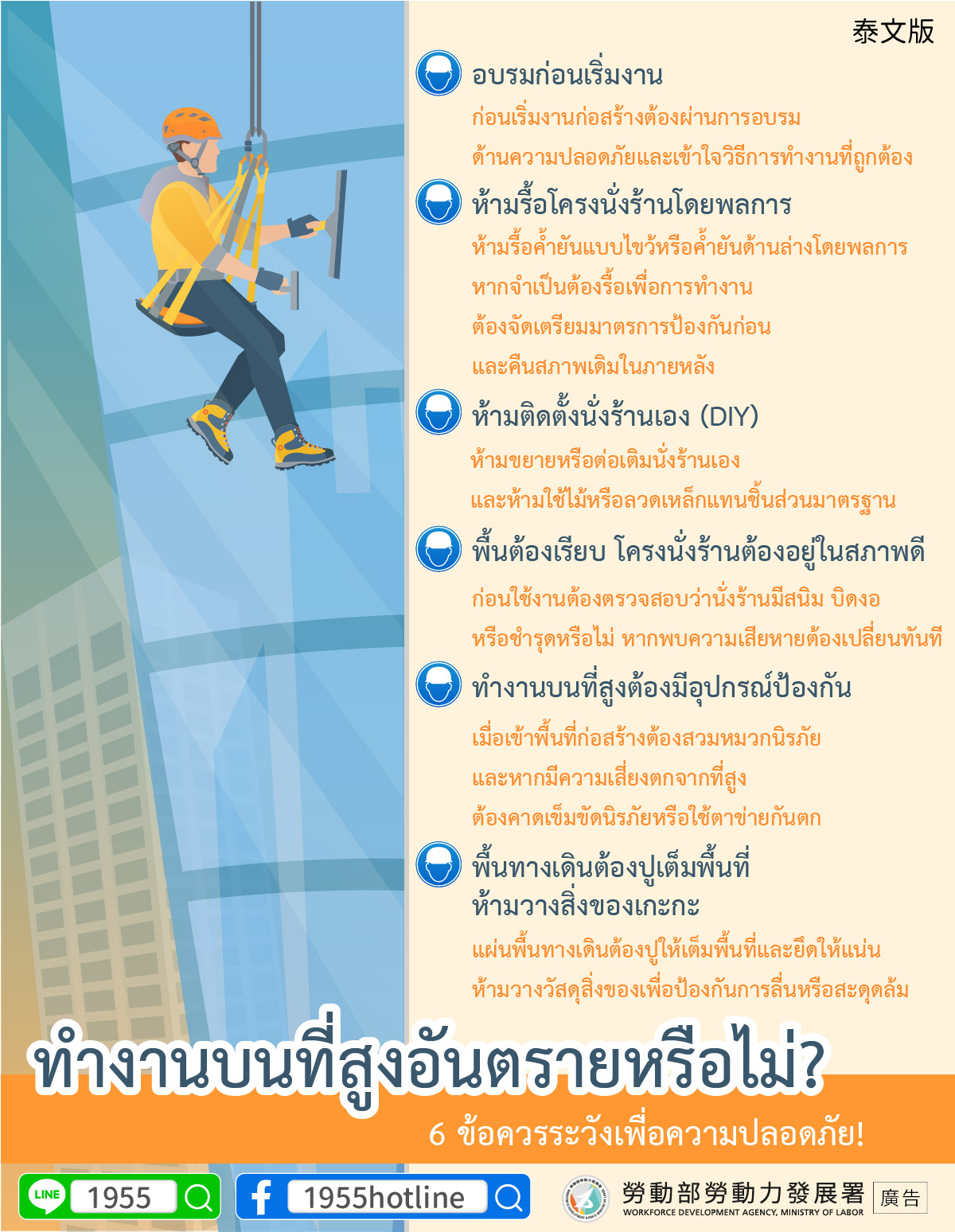 ทำงานบนที่สูงต้องมีอุปกรณ์ป้องกัน : เมื่อเข้าพื้นที่ก่อสร้างต้องสวมหมวกนิรภัย และหากมีความเสี่ยงตกจากที่สูง ต้องคาดเข็มขัดนิรภัยหรือใช้ตาข่ายกันตก