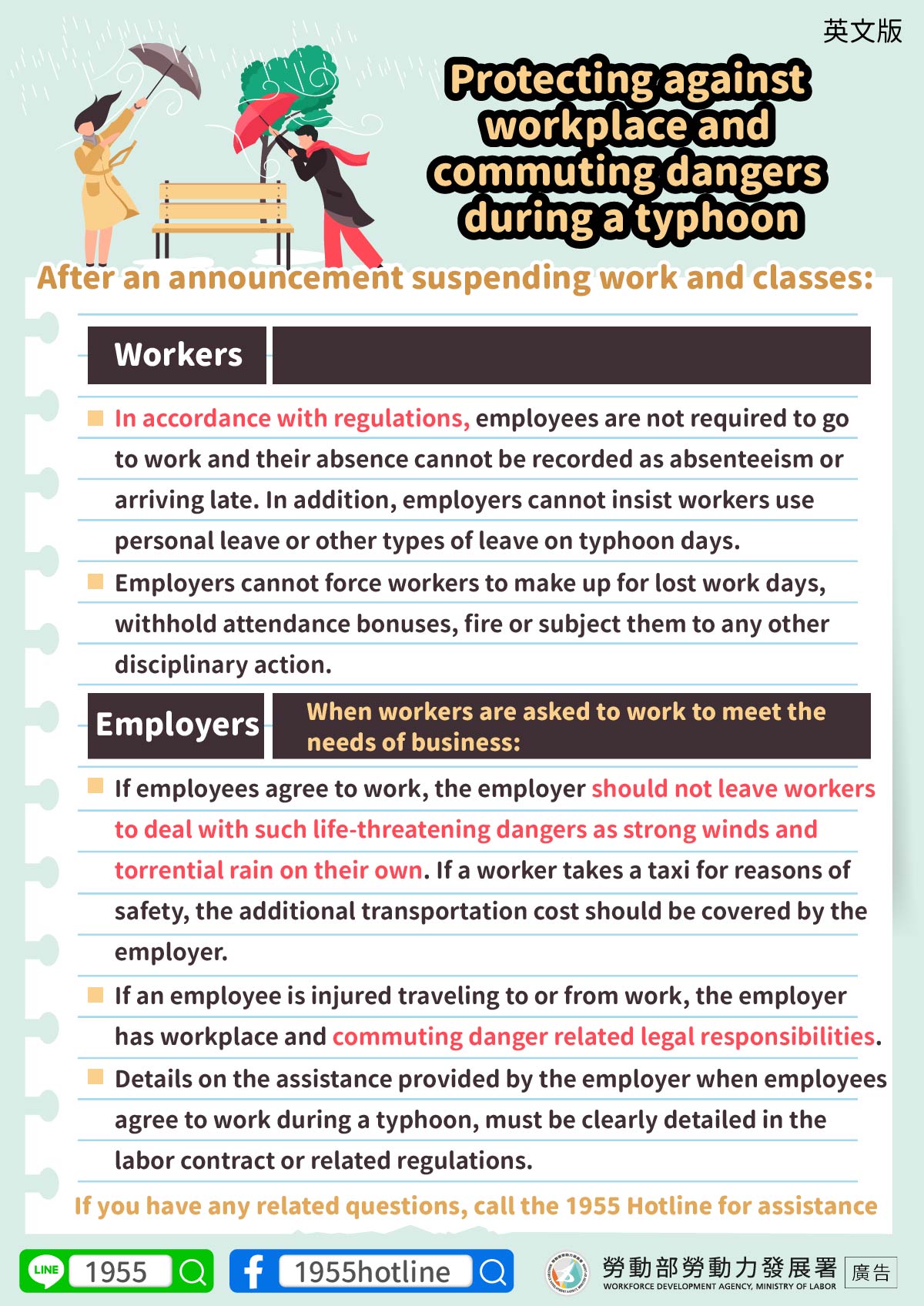 •If employees agree to work, the employer should not leave workers to deal with such life-threatening dangers as strong winds and torrential rain on their own. If a worker takes a taxi for reasons of safety, the additional transportation cost should be covered by the employer.