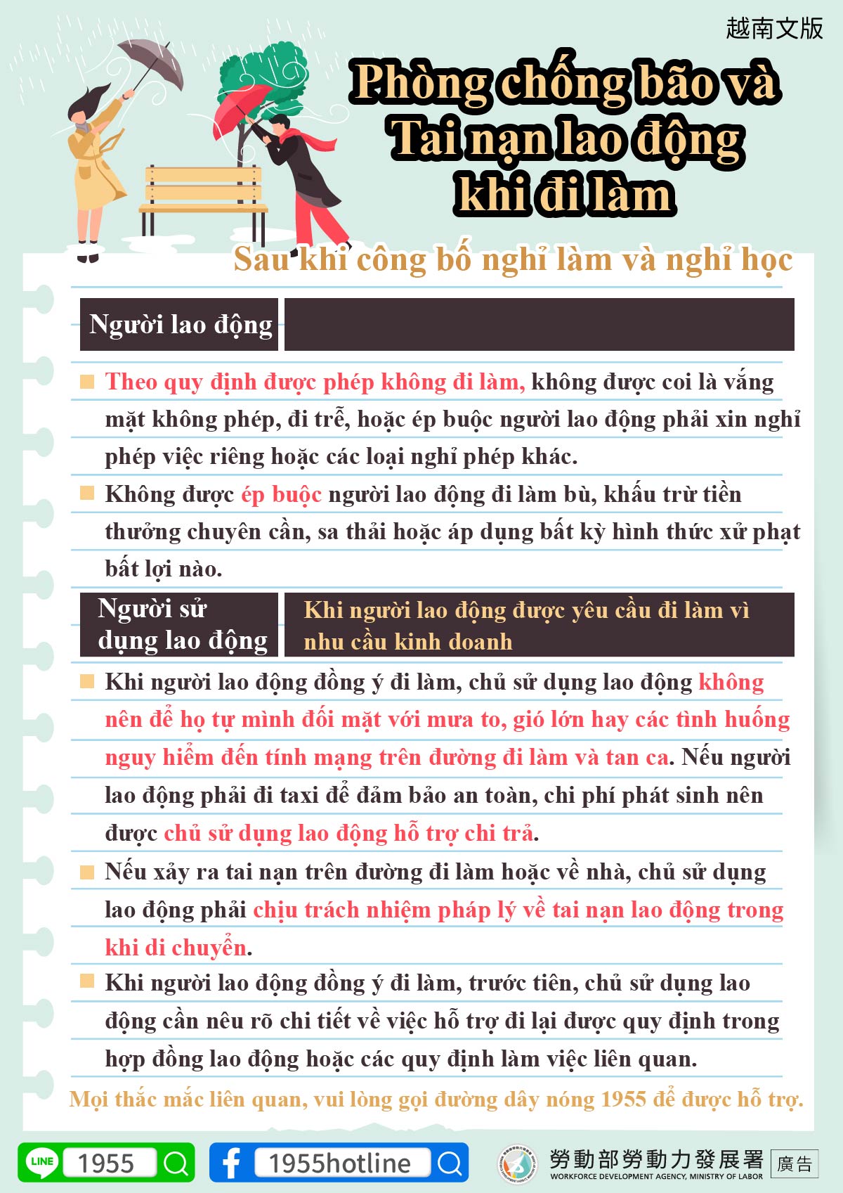 •หากลูกจ้างยินยอมมาทำงาน นายจ้างต้องไม่ปล่อยให้ลูกจ้างเผชิญกับลมกระโชกแรงหรือฝนตกหนัก ซึ่งอาจเป็นอันตรายต่อชีวิตและความปลอดภัยระหว่างเดินทางไป–กลับจากที่ทำงาน หากลูกจ้างจำเป็นต้องใช้บริการรถแท็กซี่เพื่อความปลอดภัย นายจ้างควรให้ความช่วยเหลือในค่าใช้จ่ายส่วนที่เพิ่มขึ้นดังกล่าว