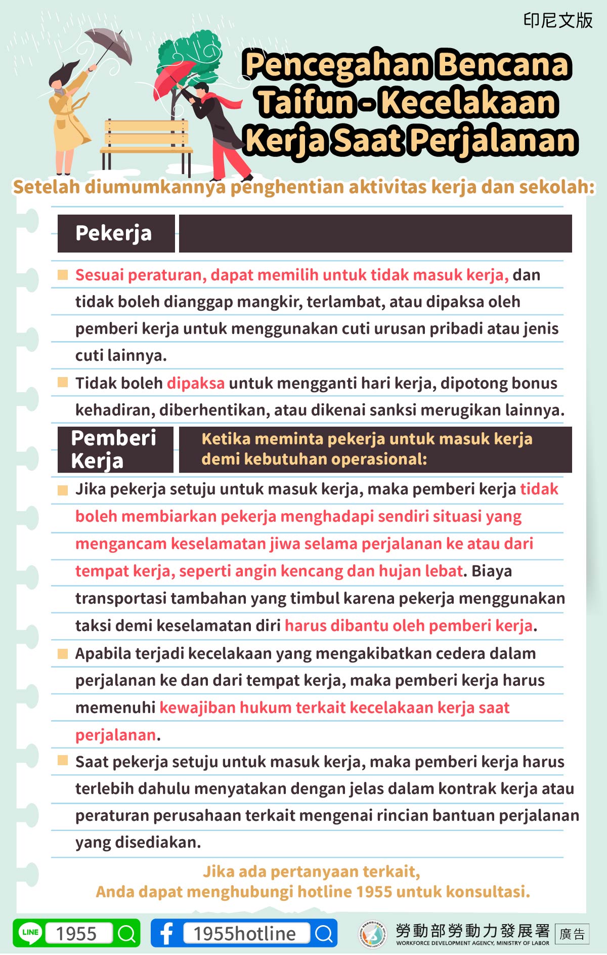 •Jika pekerja setuju untuk masuk kerja, maka pemberi kerja tidak boleh membiarkan pekerja menghadapi sendiri situasi yang mengancam keselamatan jiwa selama perjalanan ke atau dari tempat kerja, seperti angin kencang dan hujan lebat. Biaya transportasi tambahan yang timbul karena pekerja menggunakan taksi demi keselamatan diri harus dibantu oleh pemberi kerja.