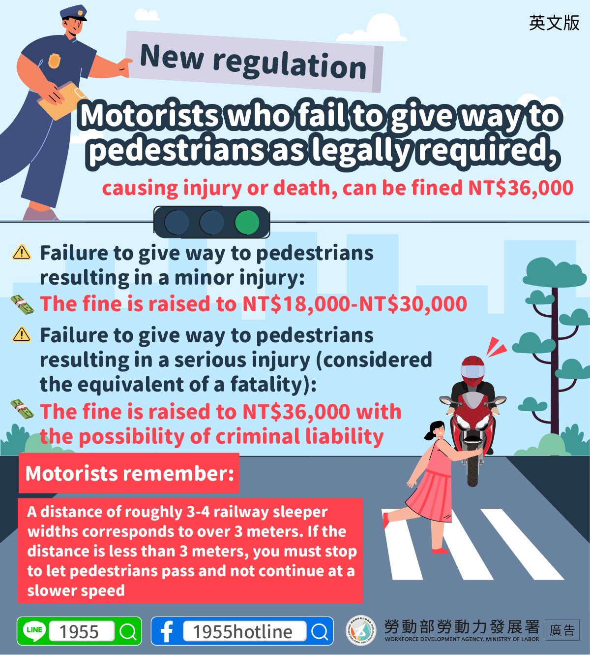 •Failure to give way to pedestrians resulting in a minor injury : The fine is raised to NT$18,000-NT$30,000