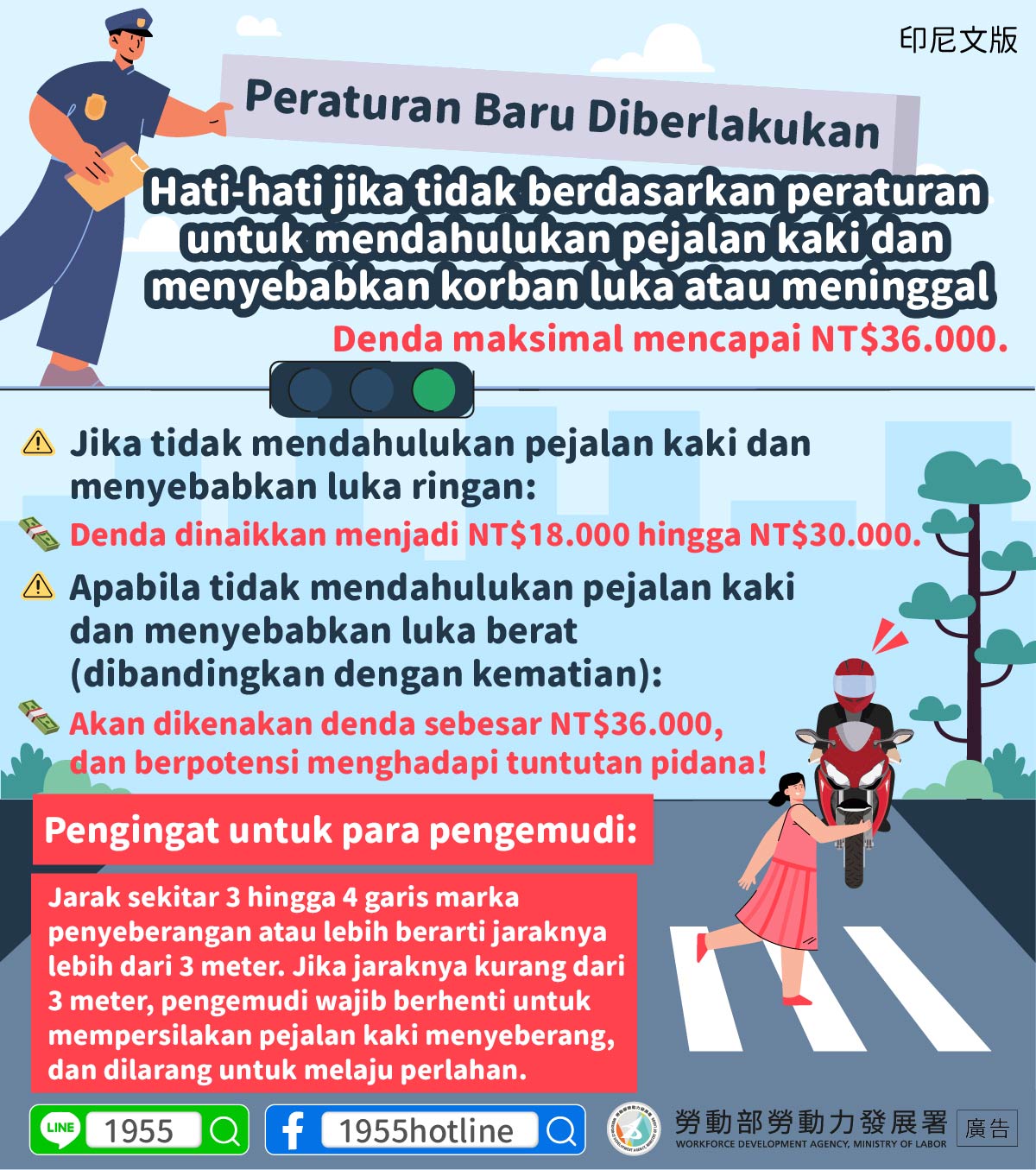 •Jika tidak mendahulukan pejalan kaki dan menyebabkan luka ringan : Denda dinaikkan menjadi NT$18.000 hingga NT$30.000.