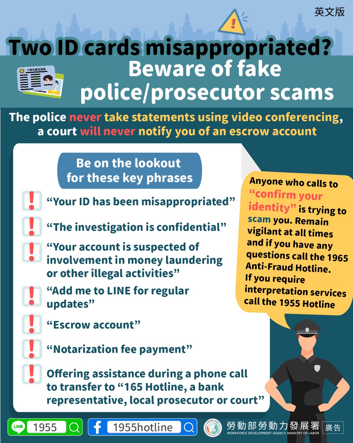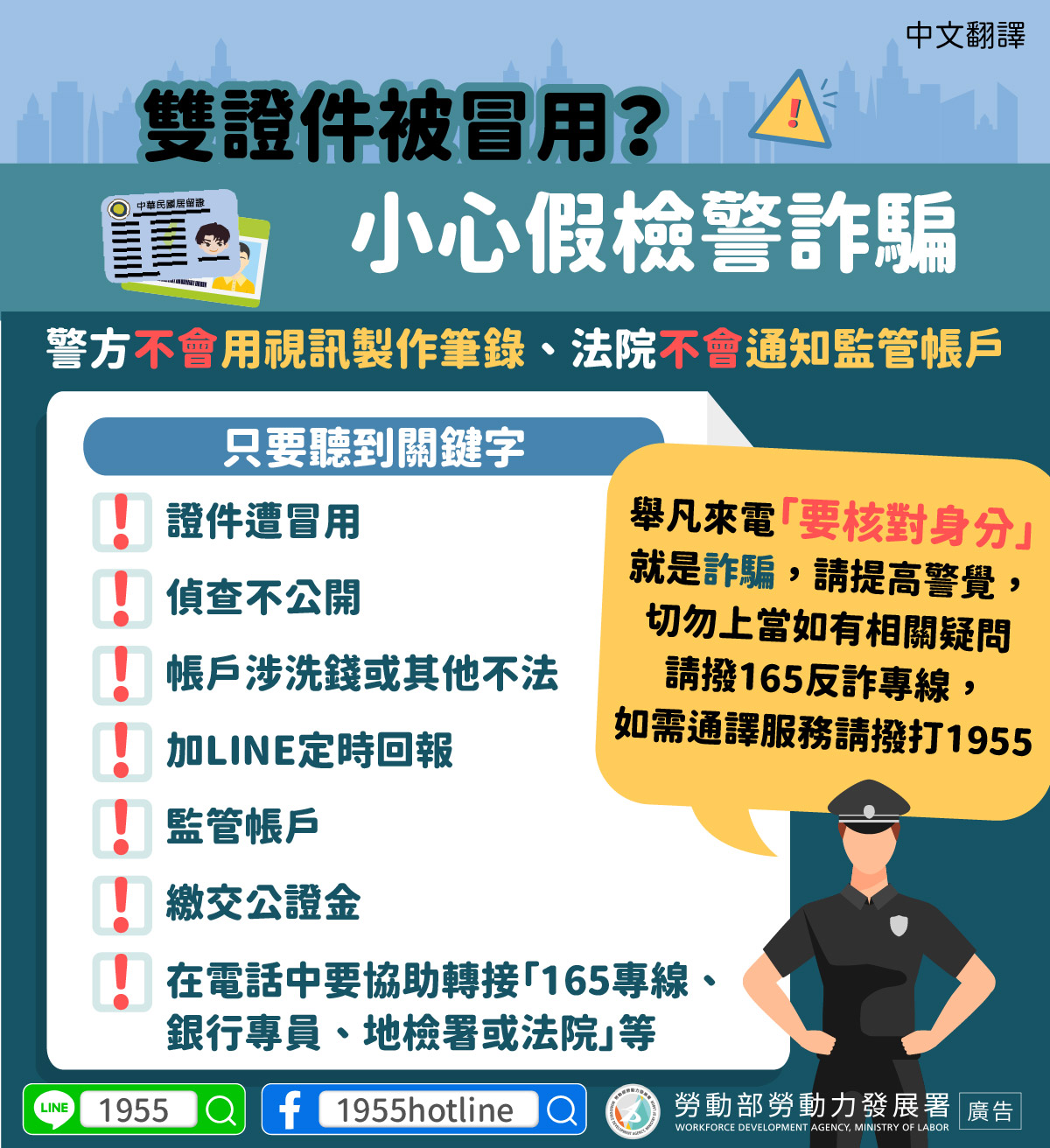 舉凡來電「要核對身分」就是詐騙,請提高警覺,切勿上當如有相關疑問請撥165反詐專線,如需通譯服務請撥打1955