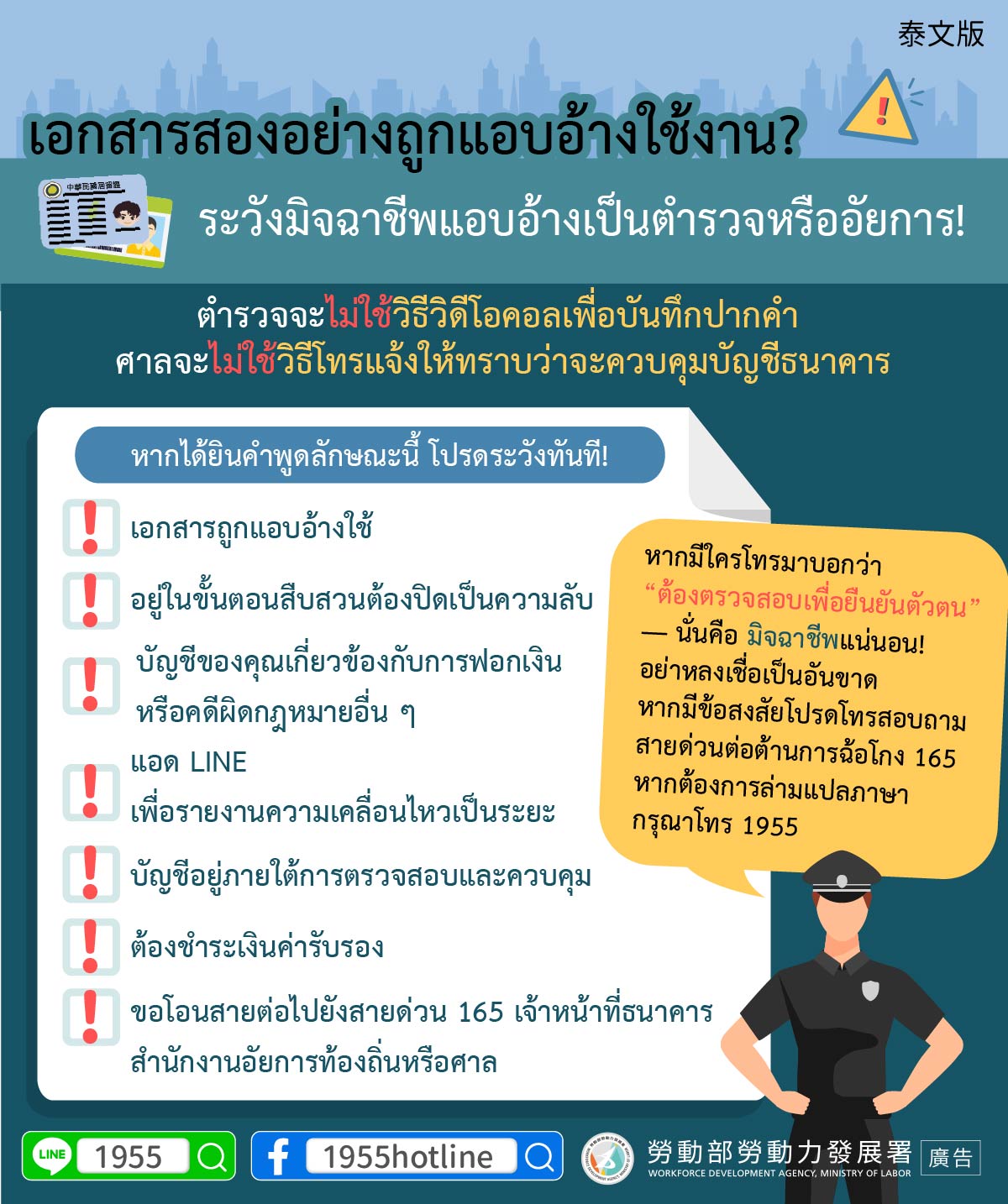 หากมีใครโทรมาบอกว่า “ต้องตรวจสอบเพื่อยืนยันตัวตน” — นั่นคือ มิจฉาชีพแน่นอน! อย่าหลงเชื่อเป็นอันขาด หากมีข้อสงสัยโปรดโทรสอบถามสายด่วนต่อต้านการฉ้อโกง 165 หากต้องการล่ามแปลภาษากรุณาโทร 1955