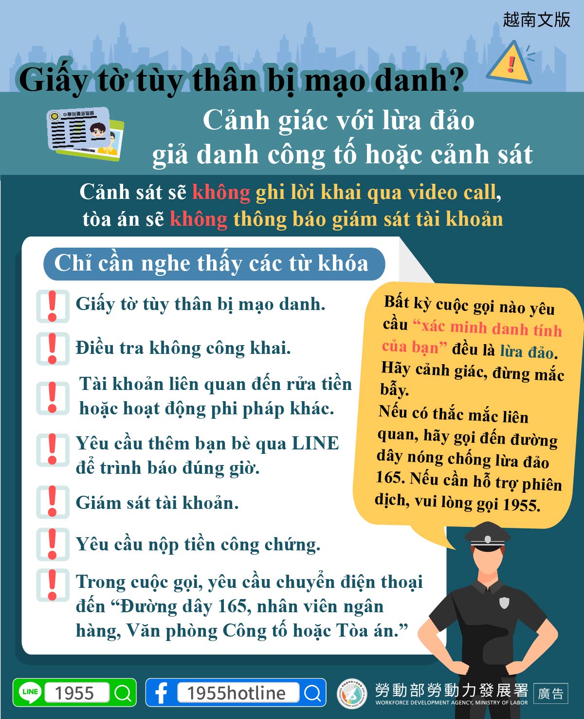 Bất kỳ cuộc gọi nào yêu cầu “xác minh danh tính của bạn” đều là lừa đảo. Hãy cảnh giác, đừng mắc bẫy.Nếu có thắc mắc liên quan, hãy gọi đến đường dây nóng chống lừa đảo 165. Nếu cần hỗ trợ phiên dịch, vui lòng gọi 1955.
