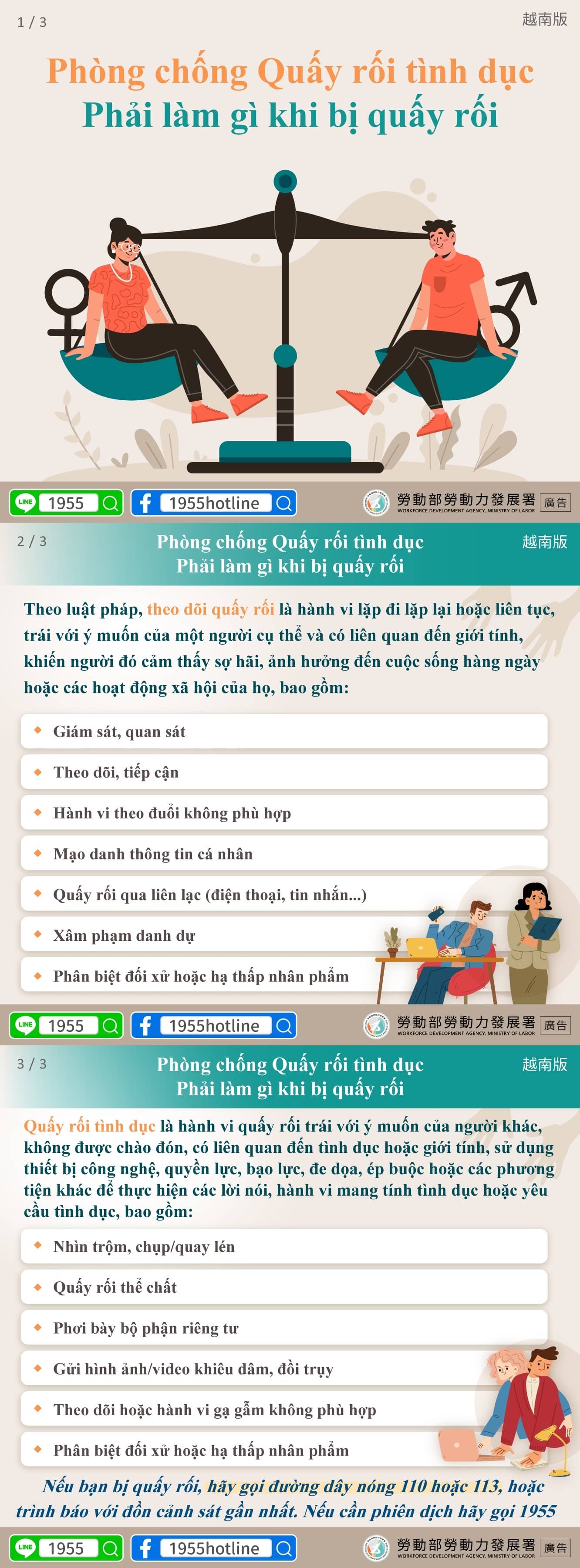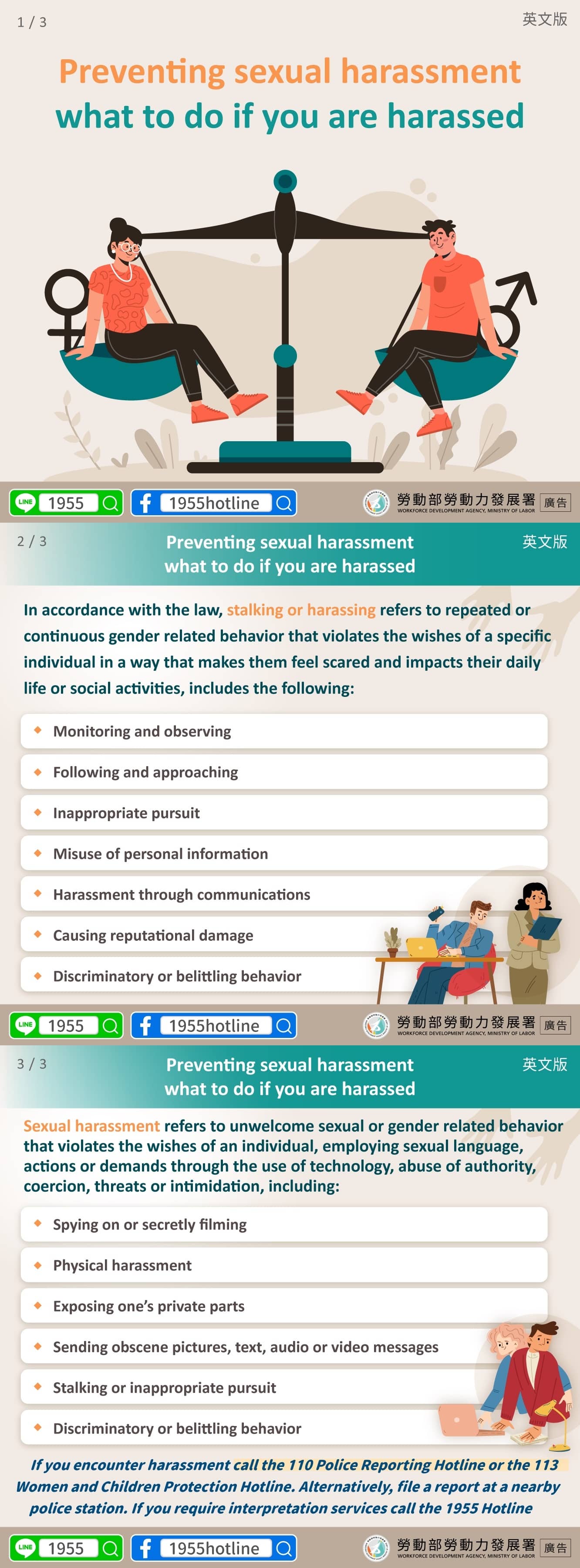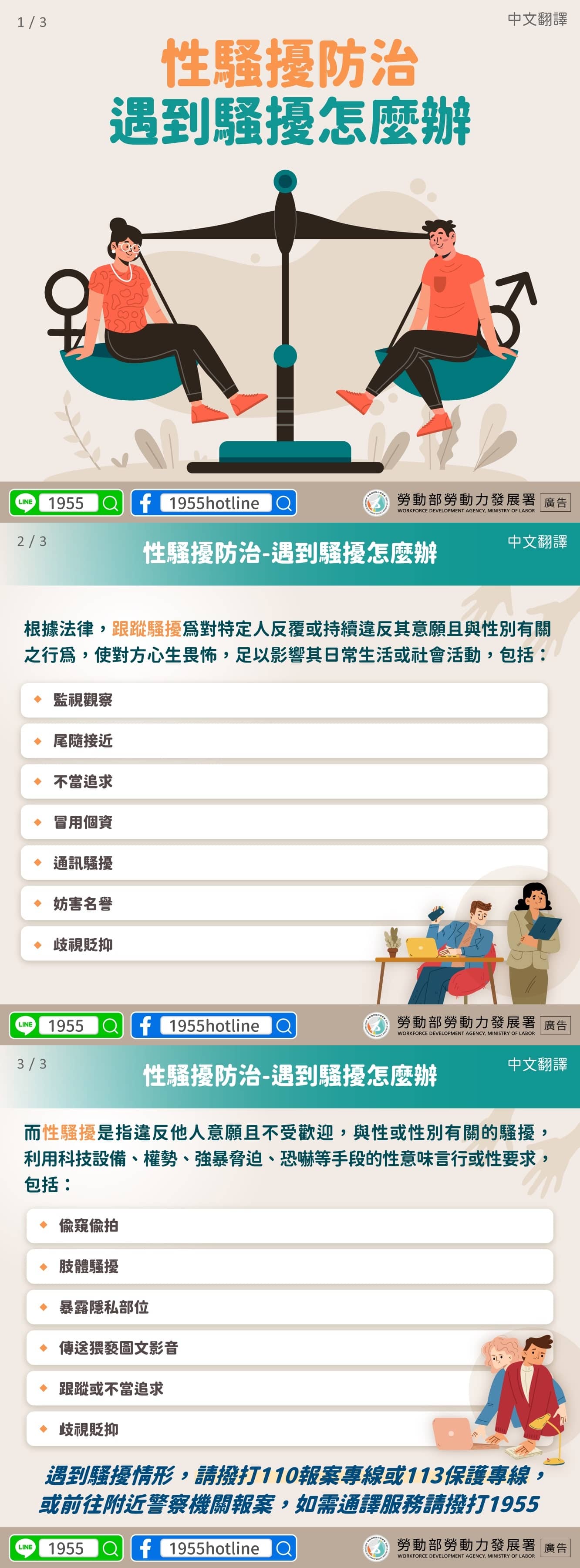 遇到騷擾情形,請撥打110報案專線或113保護專線,或前往附近警察機關報案,如需通譯服務請撥打1955