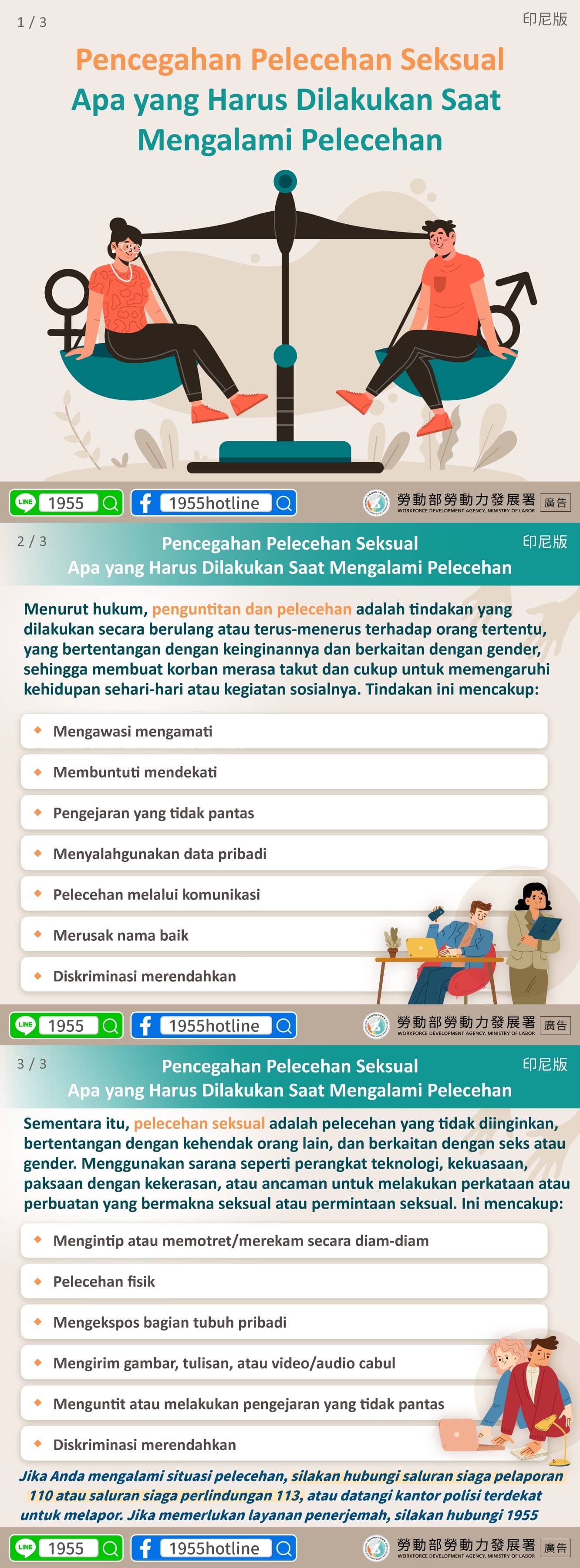Jika Anda mengalami situasi pelecehan, silakan hubungi saluran siaga pelaporan 110 atau saluran siaga perlindungan 113, atau datangi kantor polisi terdekat untuk melapor. Jika memerlukan layanan penerjemah, silakan hubungi 1955