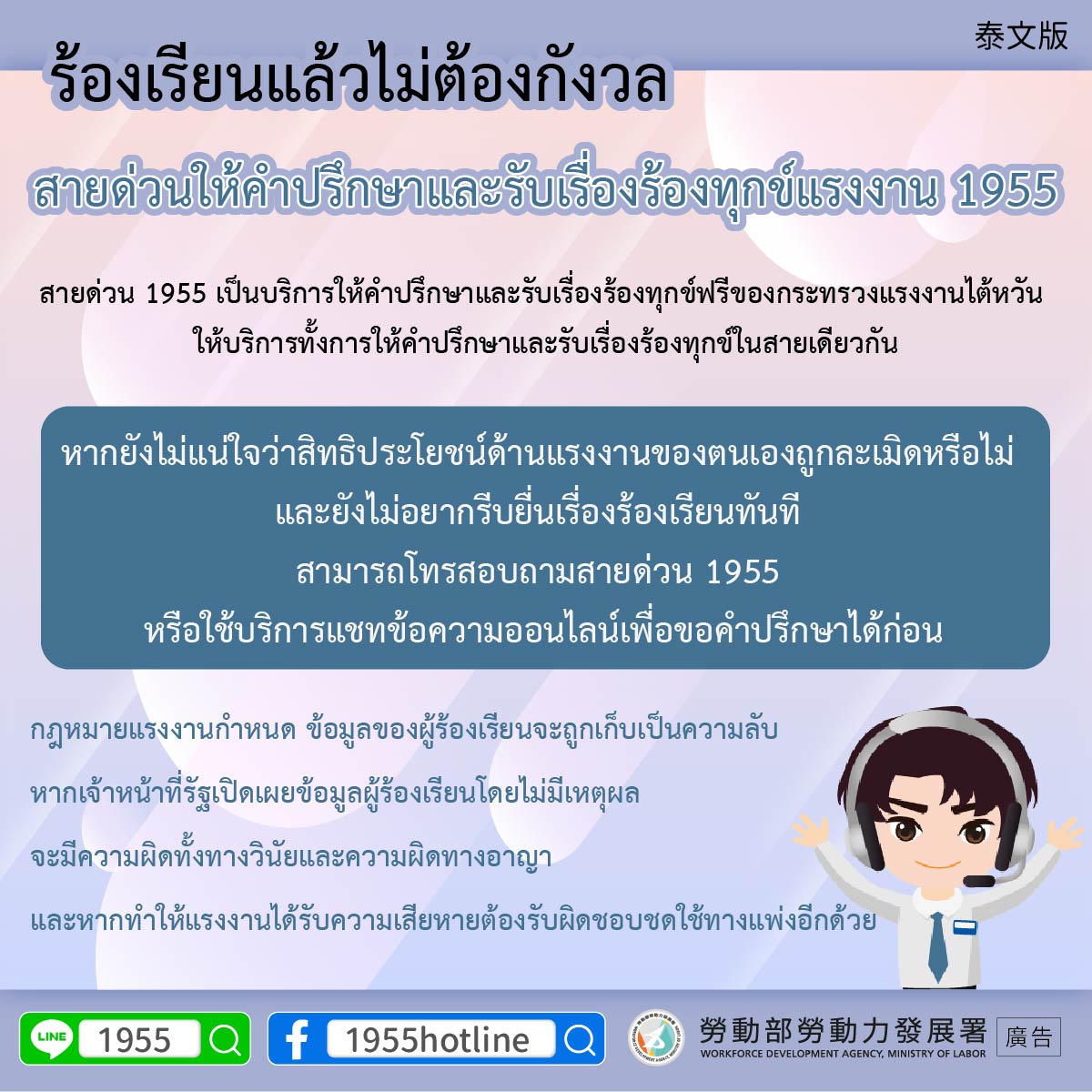 สายด่วน 1955 เป็นบริการให้คำปรึกษาและรับเรื่องร้องทุกข์ฟรีของกระทรวงแรงงานไต้หวัน ให้บริการทั้งการให้คำปรึกษาและรับเรื่องร้องทุกข์ในสายเดียวกัน