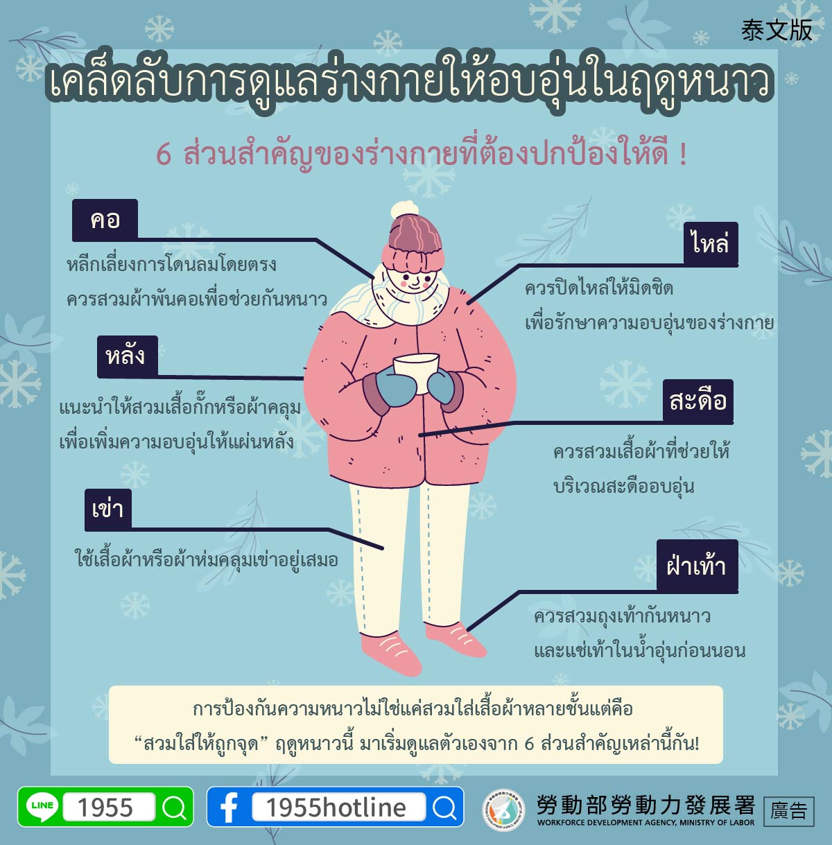 คอ : หลีกเลี่ยงการโดนลมโดยตรง ควรสวมผ้าพันคอเพื่อช่วยกันหนาว