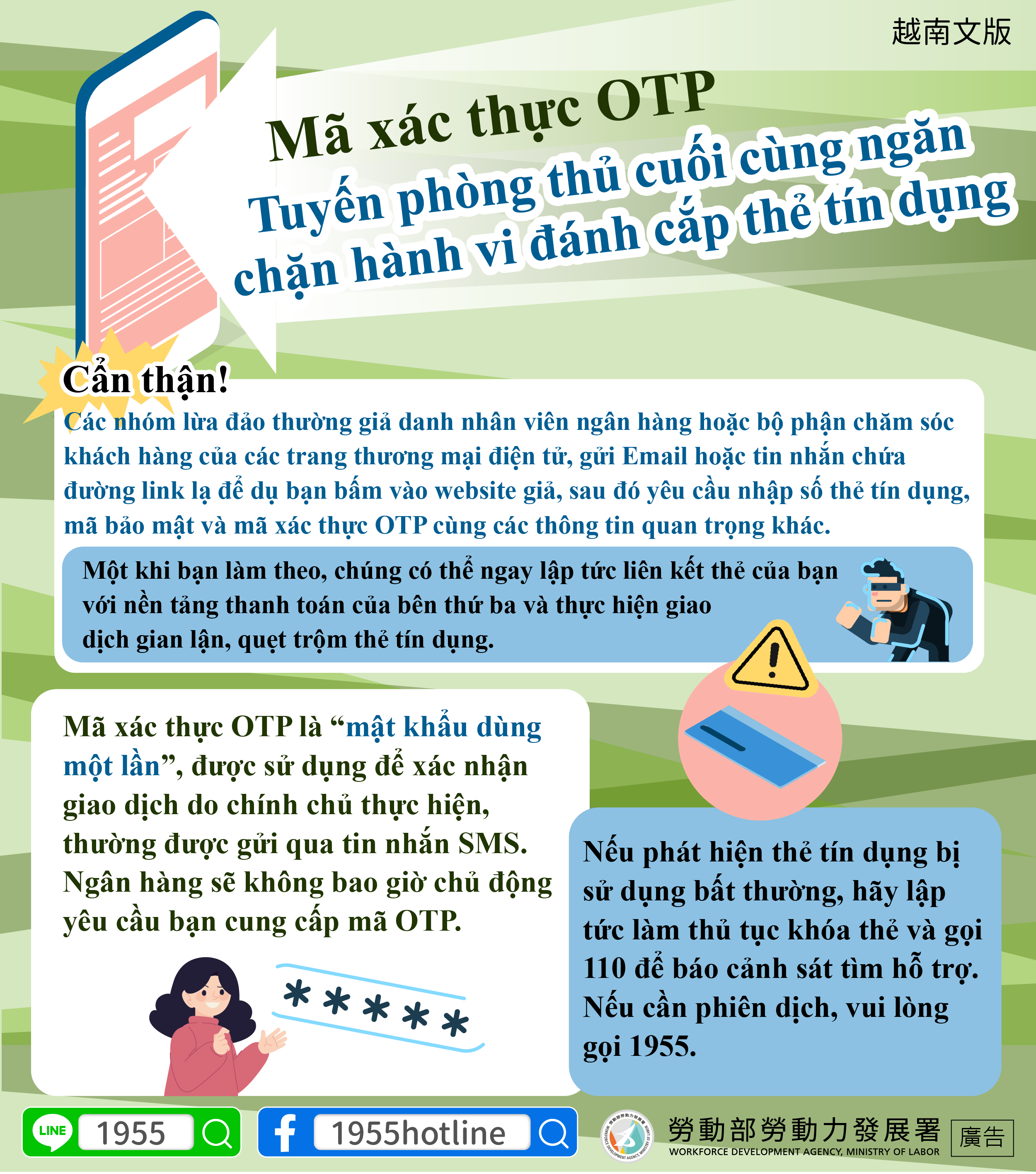 Nếu phát hiện thẻ tín dụng bị sử dụng bất thường, hãy lập tức làm thủ tục khóa thẻ và gọi 110 để báo cảnh sát tìm hỗ trợ.Nếu cần phiên dịch, vui lòng gọi 1955.
