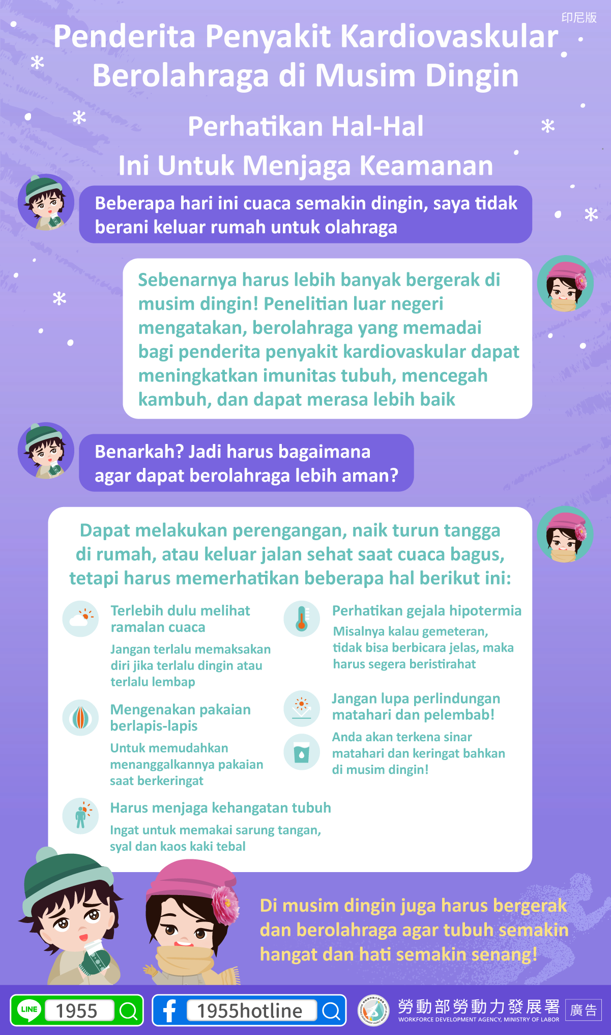 B:其實冬天更要活動一下喔!國外研究說,心血管疾病的人冬天適度運動,可以增強免疫力、預防復發,還能讓心情更好