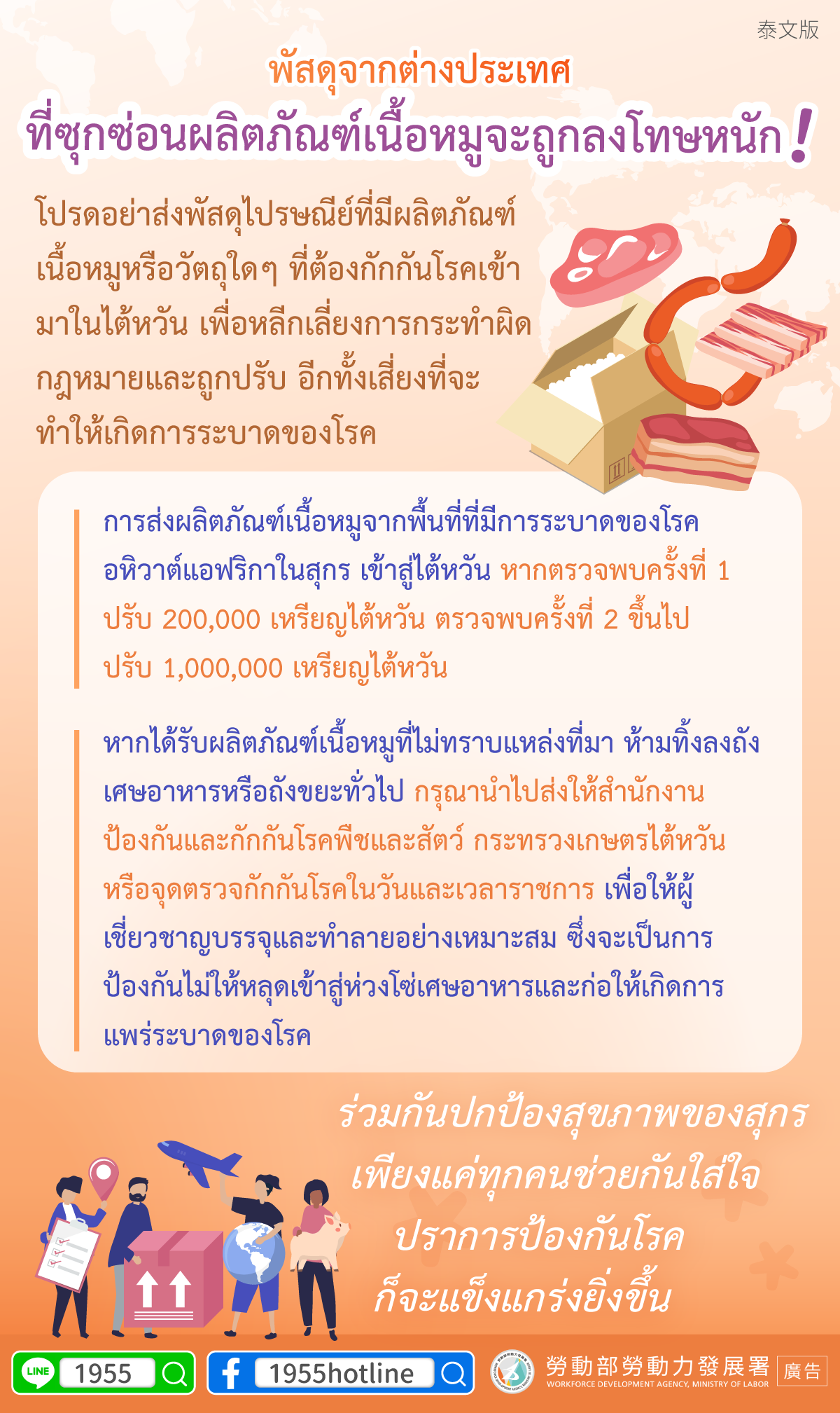 โปรดอย่าส่งพัสดุไปรษณีย์ที่มีผลิตภัณฑ์เนื้อหมูหรือวัตถุใดๆ ที่ต้องกักกันโรคเข้ามาในไต้หวัน เพื่อหลีกเลี่ยงการกระทำผิดกฎหมายและถูกปรับ อีกทั้งเสี่ยงที่จะทำให้เกิดการระบาดของโรค