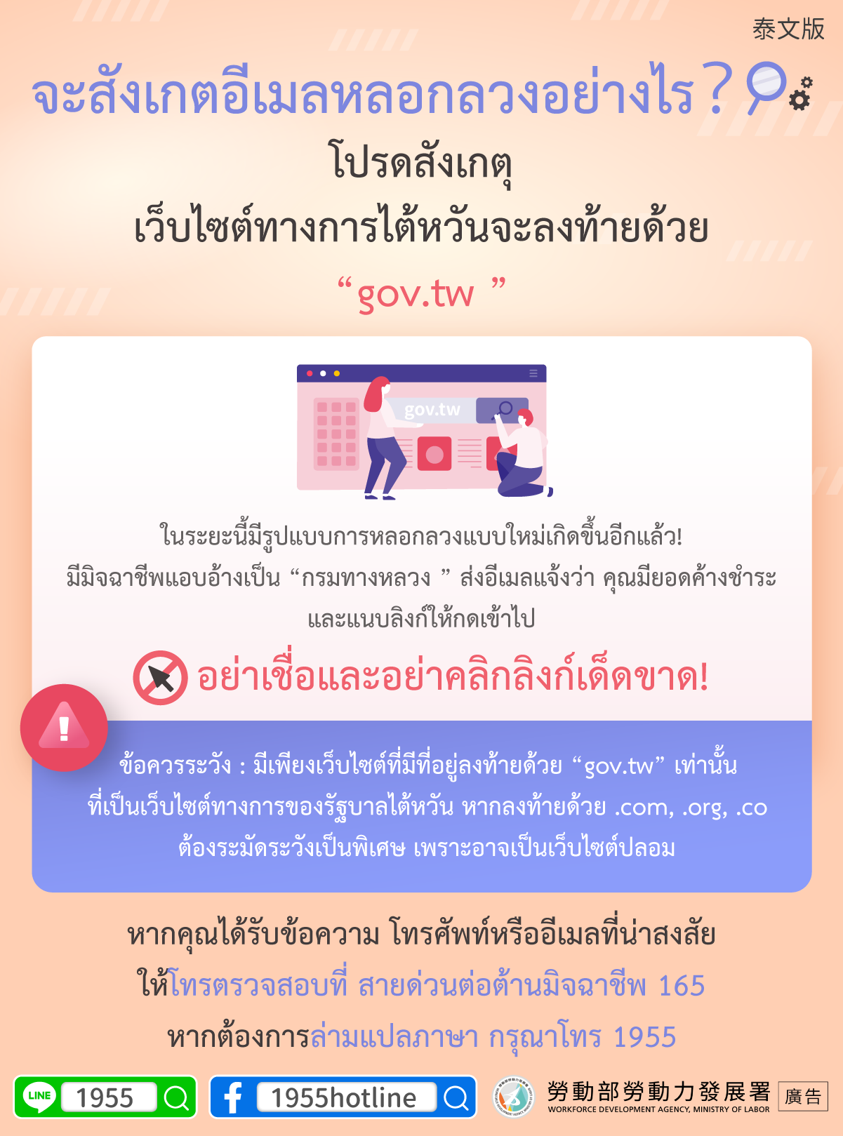 หากคุณได้รับข้อความ โทรศัพท์หรืออีเมลที่น่าสงสัยให้โทรตรวจสอบที่ สายด่วนต่อต้านมิจฉาชีพ 165หากต้องการล่ามแปลภาษา กรุณาโทร 1955