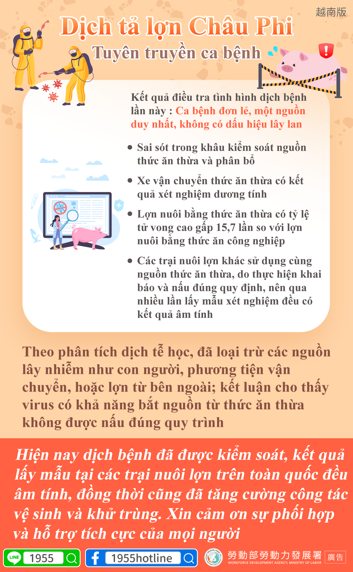 The outbreak is now under control. Samples from pig farms across Taiwan tested negative, and cleaning and disinfection operations have been enhanced. A special thank you to everyone for their active cooperation and assistance