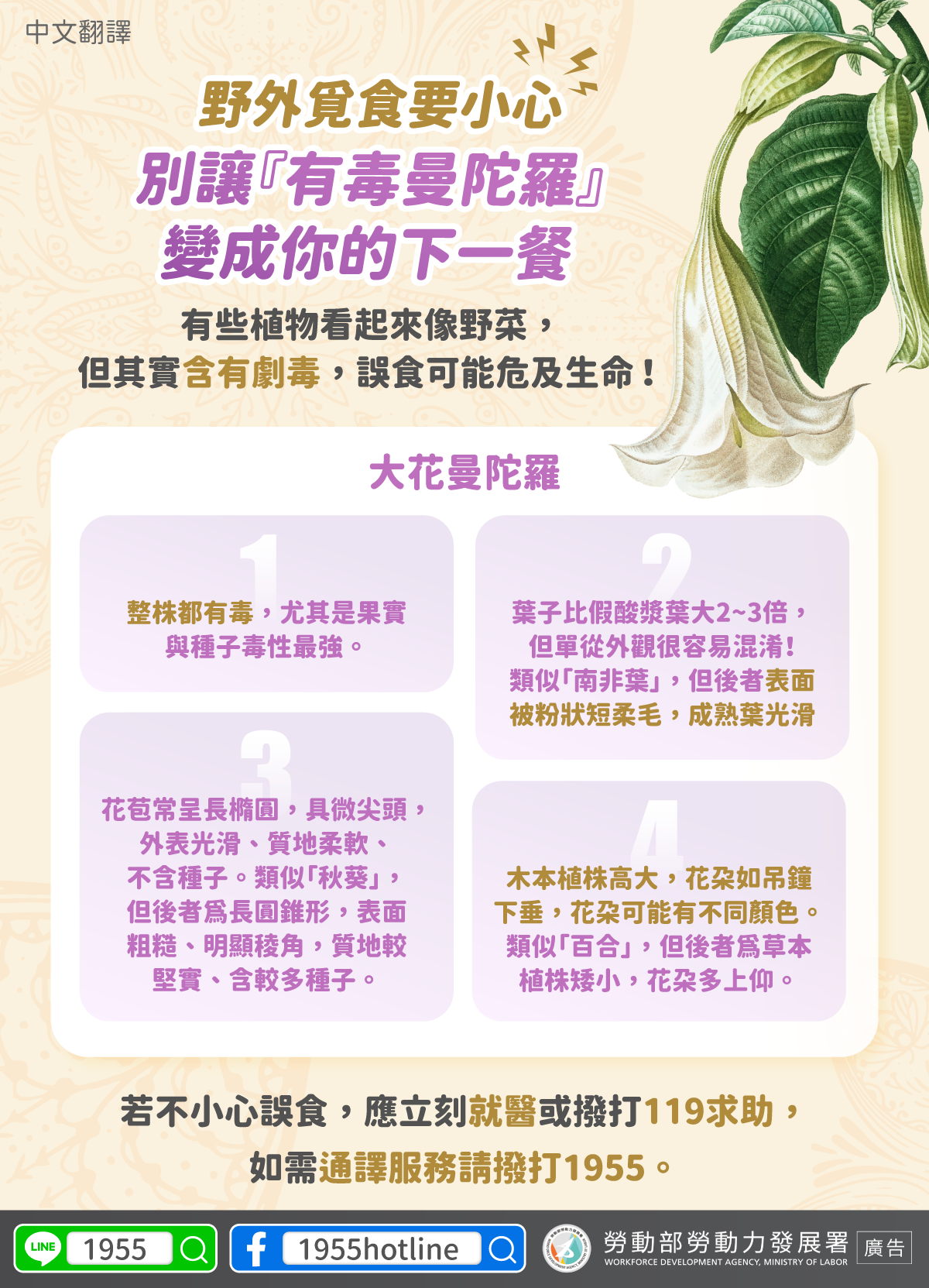 若不小心誤食,應立刻就醫或撥打119求助,如需通譯服務請撥打1955