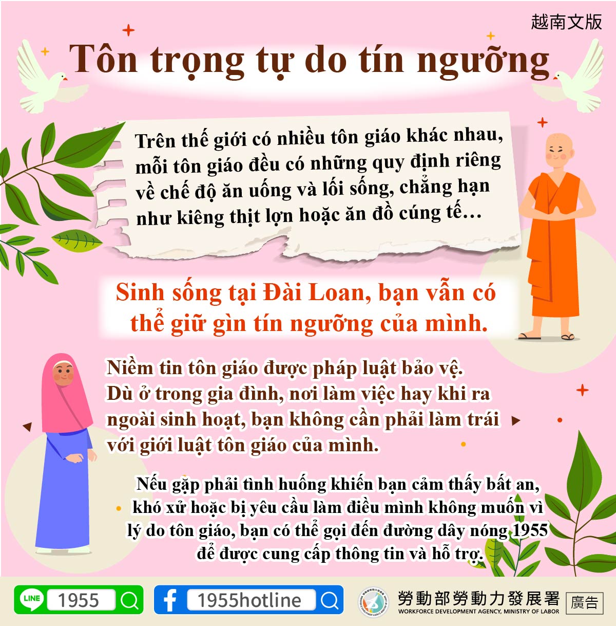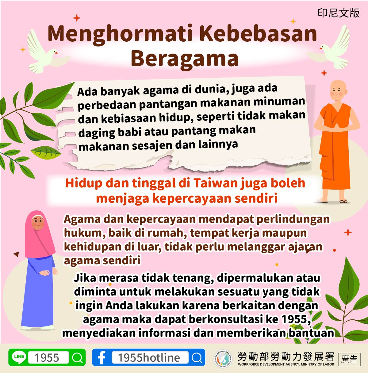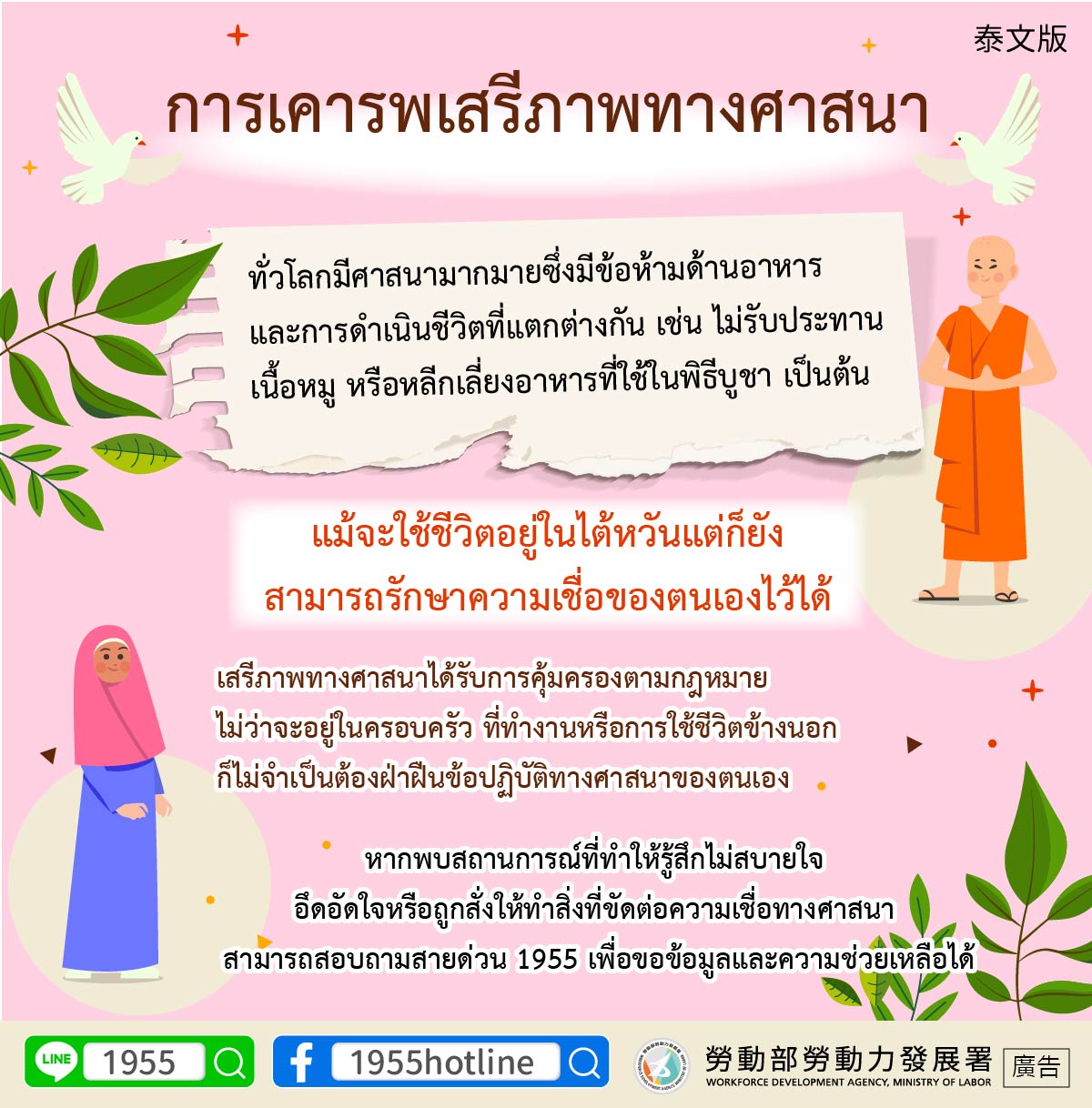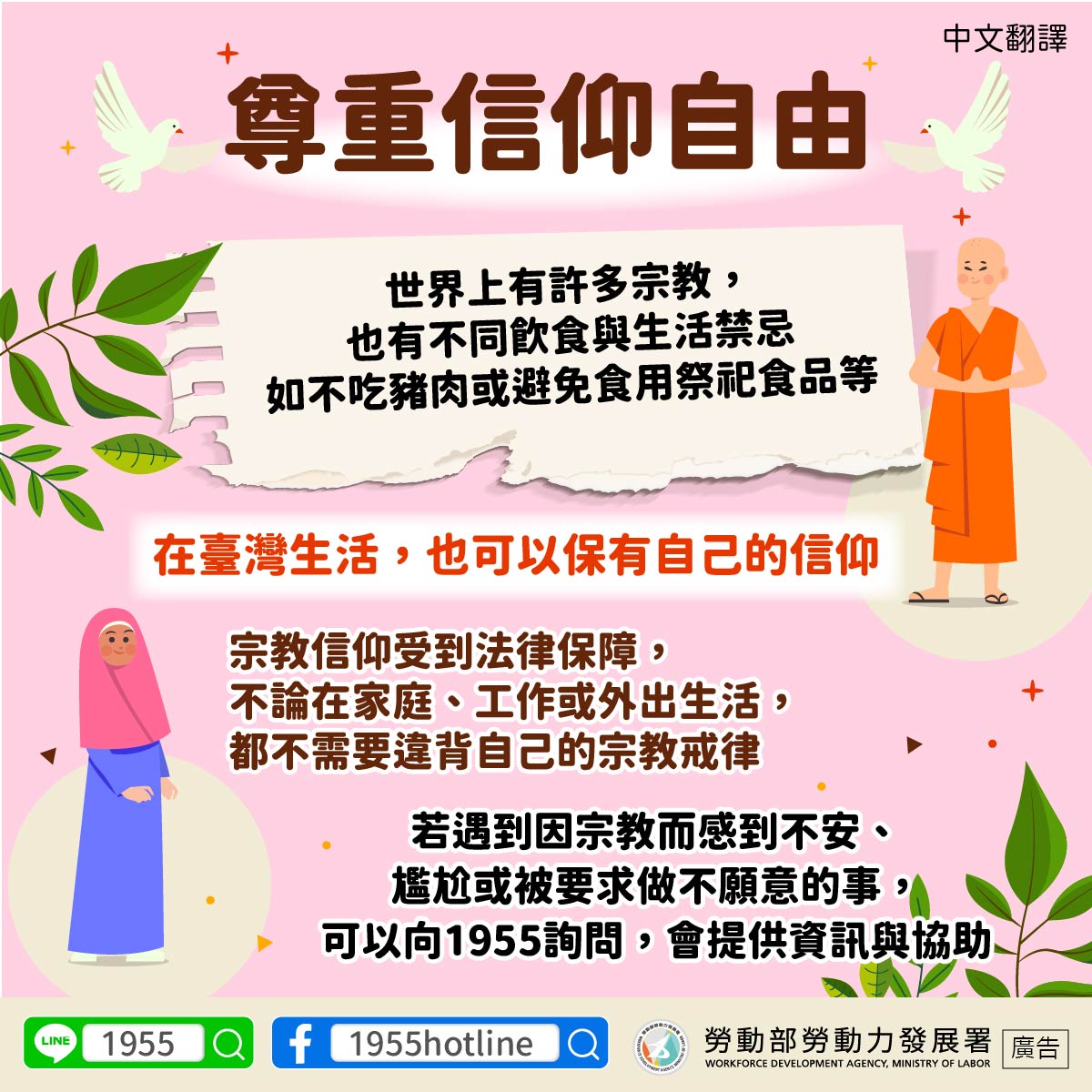 若遇到因宗教而感到不安、尷尬或被要求做不願意的事,可以向1955詢問,會提供資訊與協助