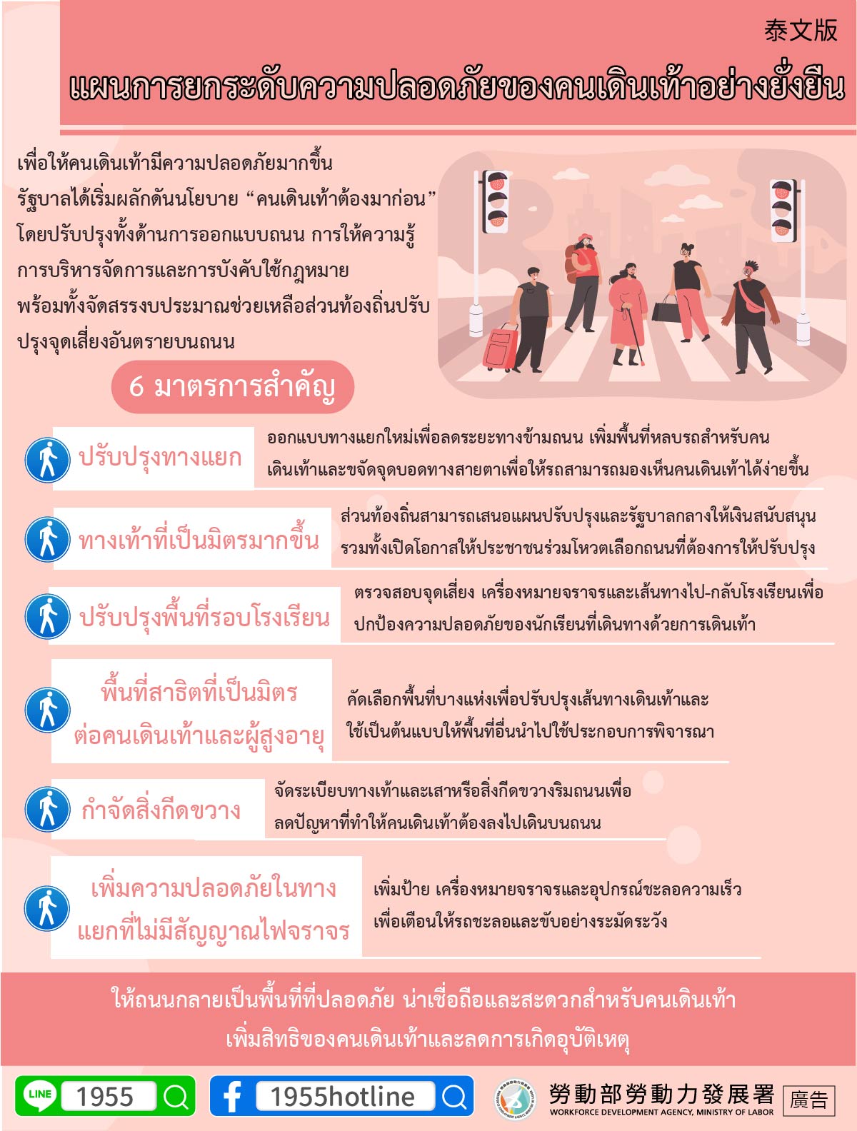 ให้ถนนกลายเป็นพื้นที่ที่ปลอดภัย น่าเชื่อถือและสะดวกสำหรับคนเดินเท้า เพิ่มสิทธิของคนเดินเท้าและลดการเกิดอุบัติเหตุ