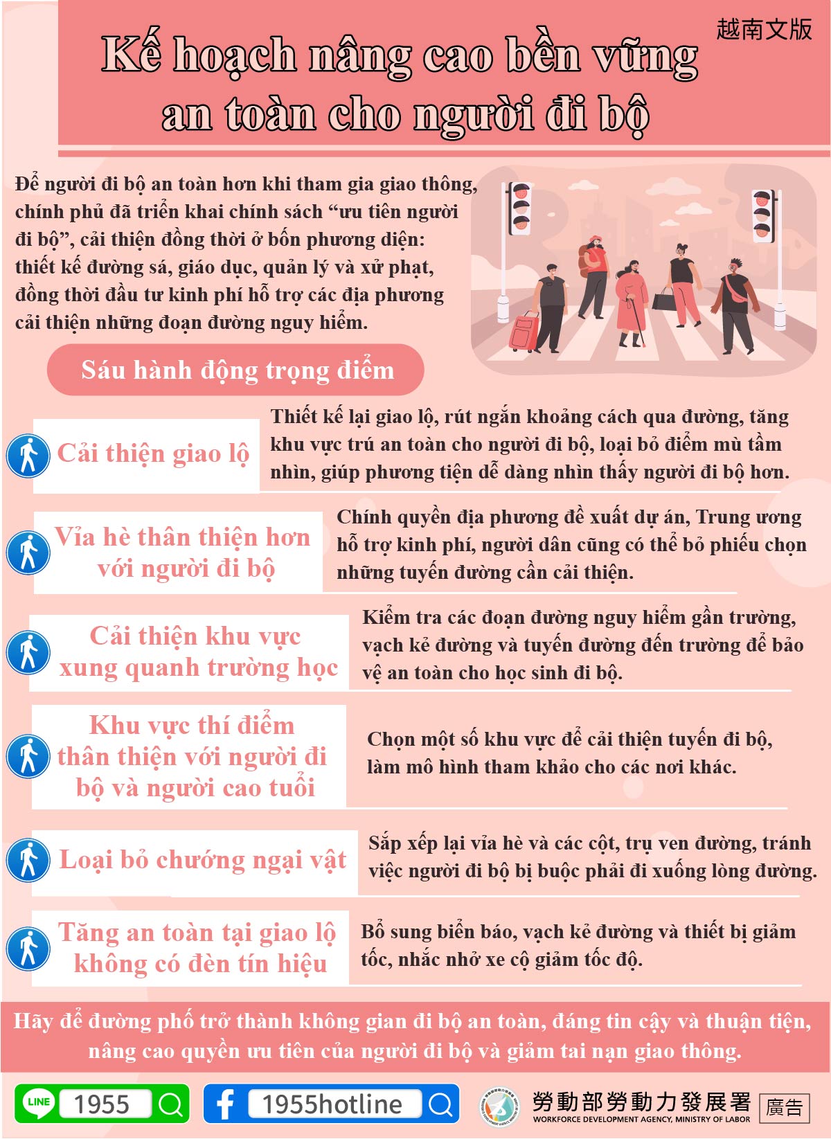 Để người đi bộ an toàn hơn khi tham gia giao thông, chính phủ đã triển khai chính sách “ưu tiên người đi bộ”, cải thiện đồng thời ở bốn phương diện: thiết kế đường sá, giáo dục, quản lý và xử phạt, đồng thời đầu tư kinh phí hỗ trợ các địa phương cải thiện những đoạn đường nguy hiểm.
