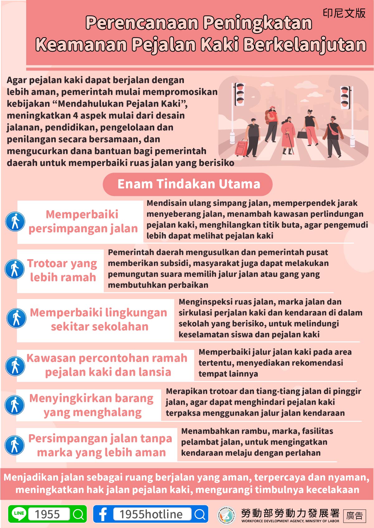 Menjadikan jalan sebagai ruang berjalan yang aman, terpercaya dan nyaman, meningkatkan hak jalan pejalan kaki, mengurangi timbulnya kecelakaan