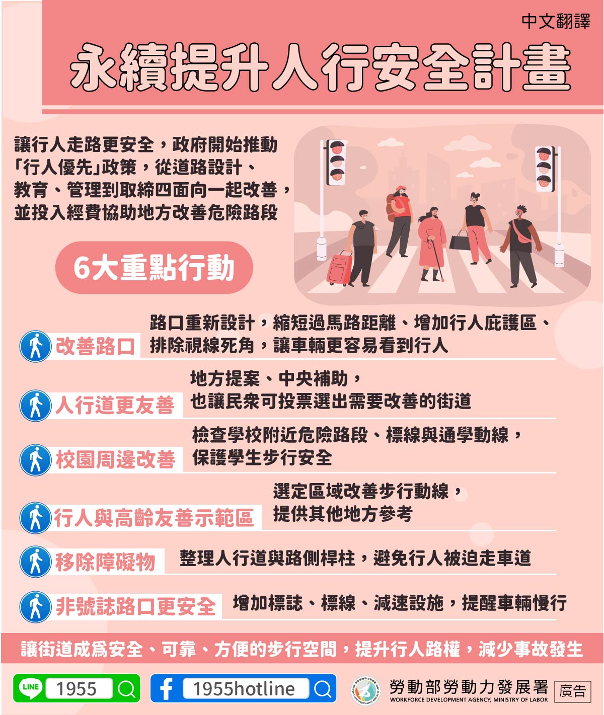 讓街道成為安全、可靠、方便的步行空間,提升行人路權,減少事故發生