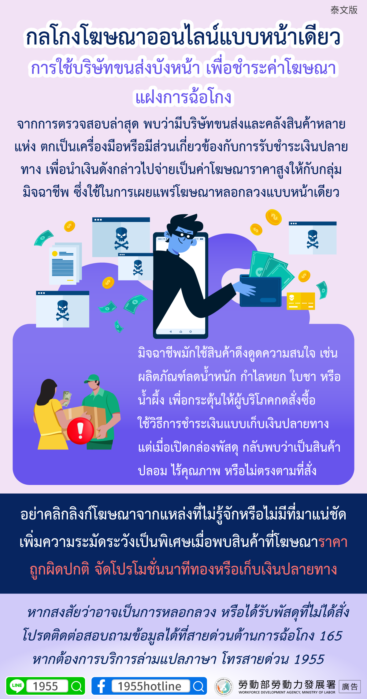 หากสงสัยว่าอาจเป็นการหลอกลวง หรือได้รับพัสดุที่ไม่ได้สั่ง โปรดติดต่อสอบถามข้อมูลได้ที่สายด่วนต้านการฉ้อโกง 165 หากต้องการบริการล่ามแปลภาษา โทรสายด่วน 1955