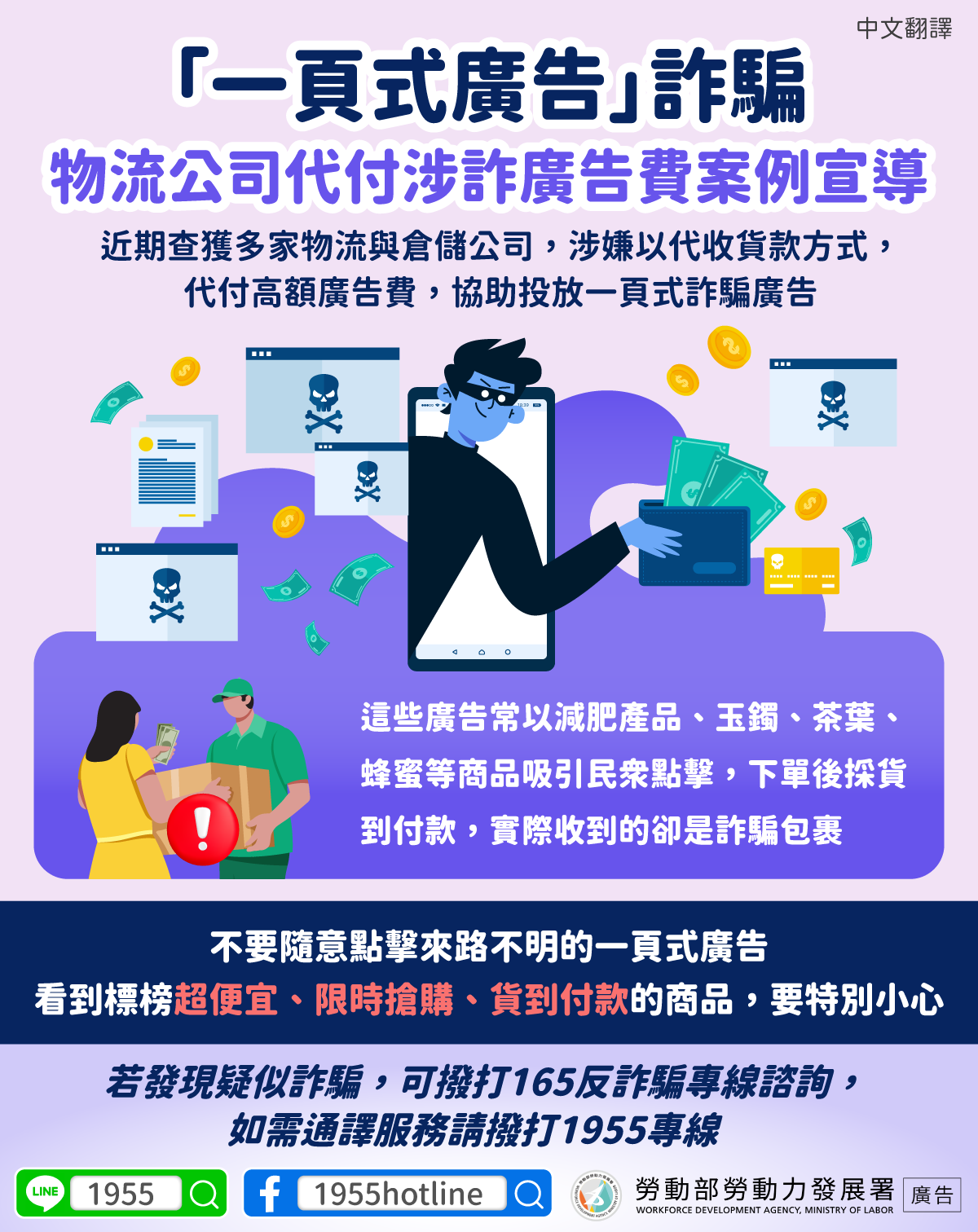 若發現疑似詐騙,可撥打165反詐騙專線諮詢,如需通譯服務請撥打1955專線